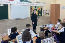 Инспектор ПДН ОП 2 "Вишневский" Мансурова А.Р. провела в 1-х классах "Урок Мужества". Она рассказала ребятам о работе полиции (милиции) в годы войны.