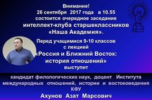 Перед учащимися 9-10 классов с лекцией «Россия и Ближний Восток: история отношений» выступит кандидат филологических наук, доцент Института международных отношений, истории и востоковедения КФУ Ахунов Азат Марсович. -