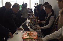 Ученик 4 "В" класса принял участие в работе Международного форума "Слет молодых инноваторов, изобретателей и рационализаторов регионов России". Романцов Арсений представил гостям мероприятия, в том числе Президенту Республики Татарстан Минниханову Р.Н., свой проект робота, собранного на базе Lego mindstorms EV3 - робот-селеноход (луноход). Он продемонстрировал все возможности робота - автономная работа, управление со смартфона по Bluetooth, а также показал, как робот танцует под музыку.