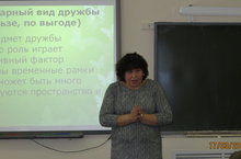 Гость клуба - Швецова Светлана Григорьевна, старший преподаватель Кафедры философии и гуманитарных дисциплин Института социальных и гуманитарных знаний, не только рассказала о философском и психологическом аспектах этого явления, но и заставила учеников 10-х классов задуматься о своём отношении к дружбе. Вопросы Светланы Григорьевны вызывали подчас абсолютно противоположные мнения старшеклассников, рождали дискуссию.