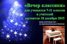 «Вечер классики» для учащихся 7-11 классов и учителей состоится 18 декабря 2015. вход в Актовый зал – по пригласительным билетам. Концерт продлится с 12.45 до 14.00.