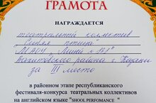 Поздравляем театральный коллектив лицея "Синяя птица" и его руководителя Рахманову Л.Р. с успешным выступлением в районном этапе республиканского фестиваля-конкурса театральных коллективов на английском языке "School performance"! Желаем новых успехов!