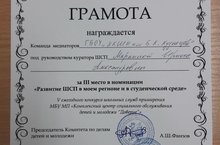 Грамотой награждается команда ГБОУ "Казанская кадетская школа-интернат им.Героя Советского Союза Б.К.Кузнецова" за 3 место в номинации "Развитие ШСП в моем регионе и в студенческой среде" в рамках 5 го ежегодного конкурса школьных служб примирения.