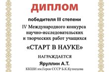 Поздравляем кадета Яруллина А.Т победителя в 4 Международном конкурсе научно-исследовательских и творческих работ учащихся "Старт науке".