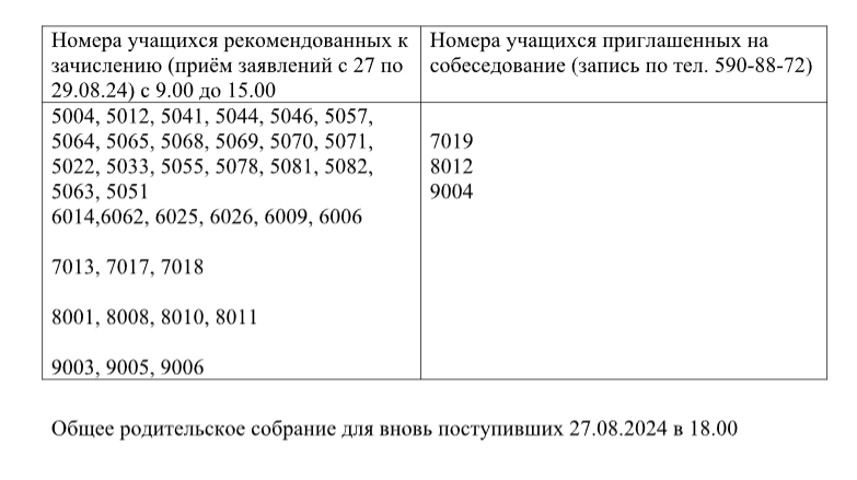 Номера учащихся, рекомендованных к зачислению в 10 класс.