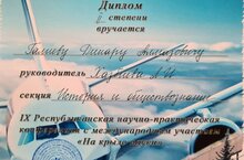 12 апреля 2022г. кадет 9б класса Галиев Динар под руководством учителя обществознания высшей квалификационной категории Хазбиевой Л.И. принял участие в IX Республиканской научно-практической конференции с международным участием "На крыле науки" в г. Чистополь и стал дипломантом 2 степени