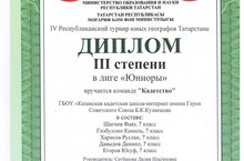 В Лиге Юниоров обладателем диплома III степени стала команда «Кадетство» ГБОУ «Казанская кадетская школа-интернат имени Героя Советского Союза Б.К.Кузнецова в составе кадет Егоров Юсуф, Давыдов Даниил, Гизбуллин Камиль из 7а класса и Шагеев Фаяз и Харисов Руслан из 7в класса.