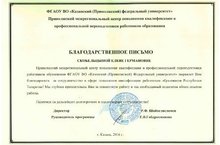 Приволжский межрегиональный центр повышения квалификации и профессиональной переподготовки работников образования ФГАОУ О "Казанский (Приволжский) федеральный университет выражает благодарность директору лицея Скобельцыной Елене Германовне за сотрудничество в сфере повышения квалификации работников образования Республики Татарстан.