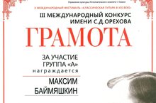 Поздравляем Баймяшкина Максима ученика 3 класса, успешно выступившего на lll Международном конкурсе им. С.Д Орехова, который проходил 20 марта в рамках X Международного фестиваля "Классическая гитара в XXl веке".