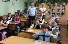 Сегодня в 1Б класс в гости к ученикам приходил инспектор ГИБДД. Он прочитал лекцию о правилах дорожного движения и о том, как вести себя во время каникул, а еще подарил всем детям светящиеся браслеты.