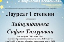 В марте ученица нашей школы, Зайнутдинова София приняла участие в IV Международном многожанровом конкурсе талантов "Творческая вселенная" в номинации "Художественное слово", в котором её наградили Дипломом 1 степени.