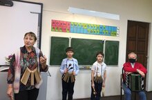 Чугунова — руководитель фольклорного коллектива, В.Н. Ветренко — аккомпаниатор, Фахретдинов Марат, Чихрадзе Тариэл -.юные исполнители, учащиеся 2Д класса. Гости познакомили первоклассников с русским и татарским фольклором, с народными танцами Европы, с различными маршами, с русскими народными инструментами и исполнили на них различные музыкальные произведения. Закончили гости своё выступление весёлыми частушками. Учащиеся 1Б класса громко аплодировали и даже пустились в пляс, потому что музыканты задорно пели и виртуозно играли на разных народных инструментах.