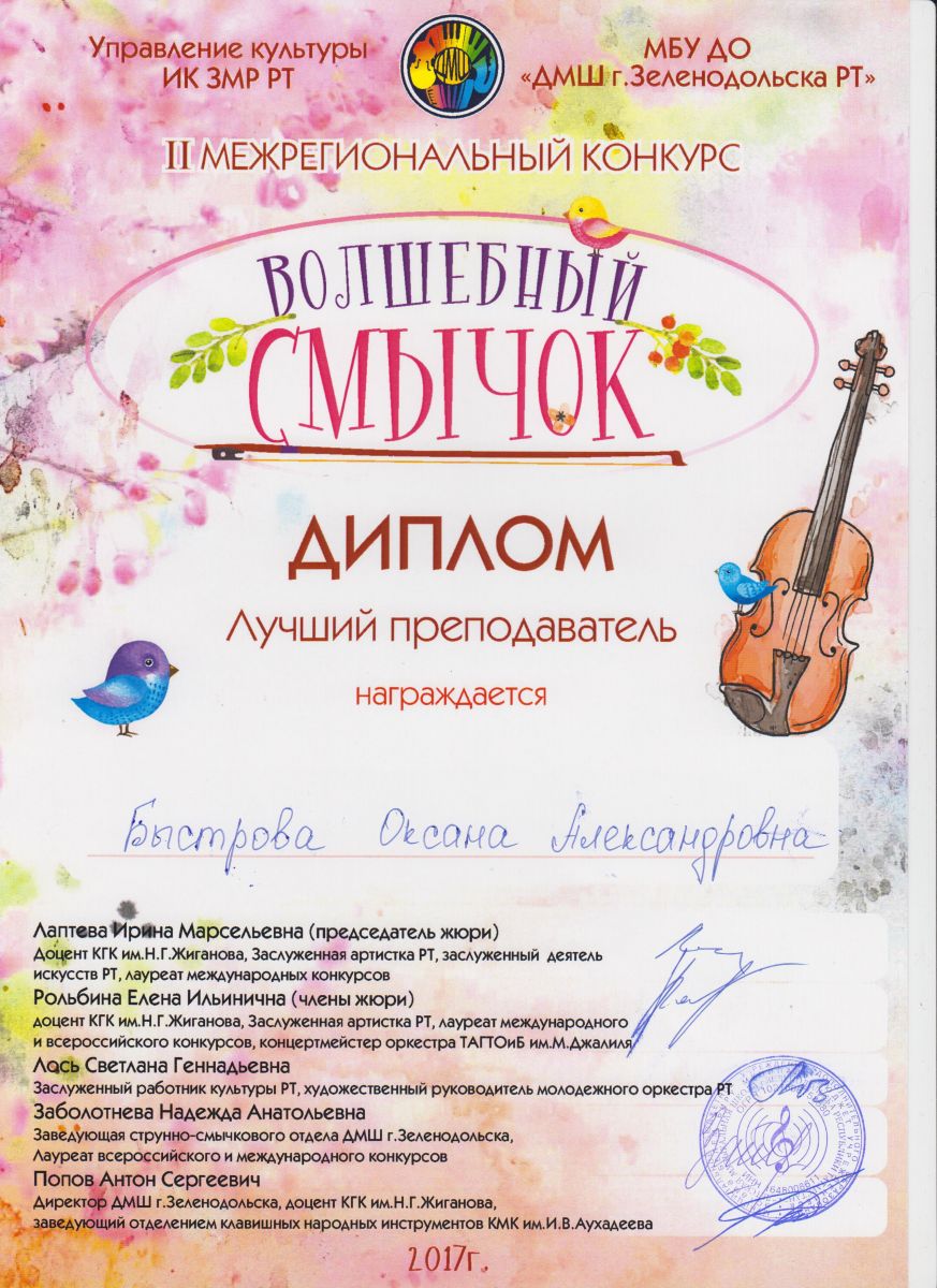 II Межрегиональный конкурс "Волшебный смычок" - Быстрова О.А., Лучший преподаватель;