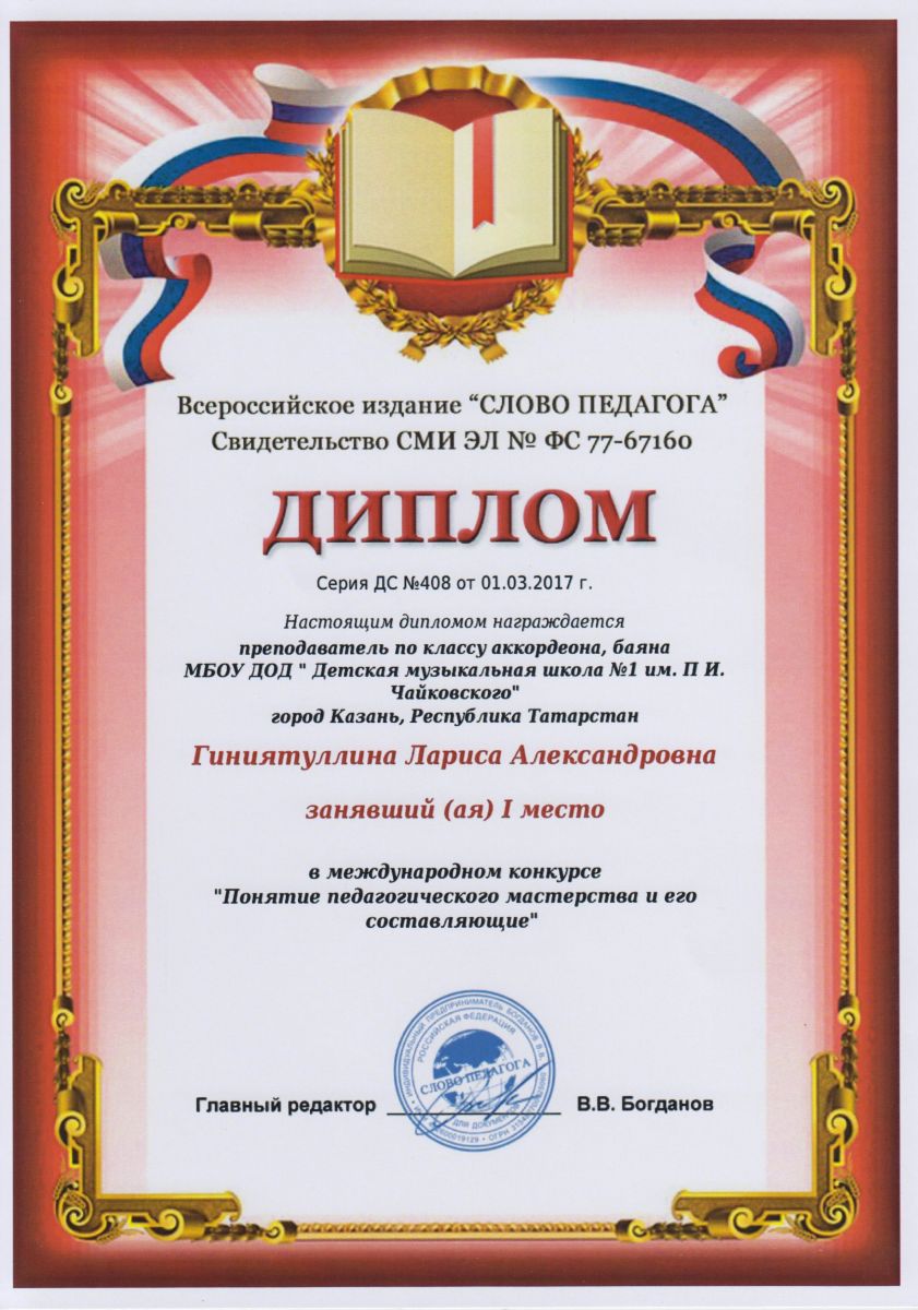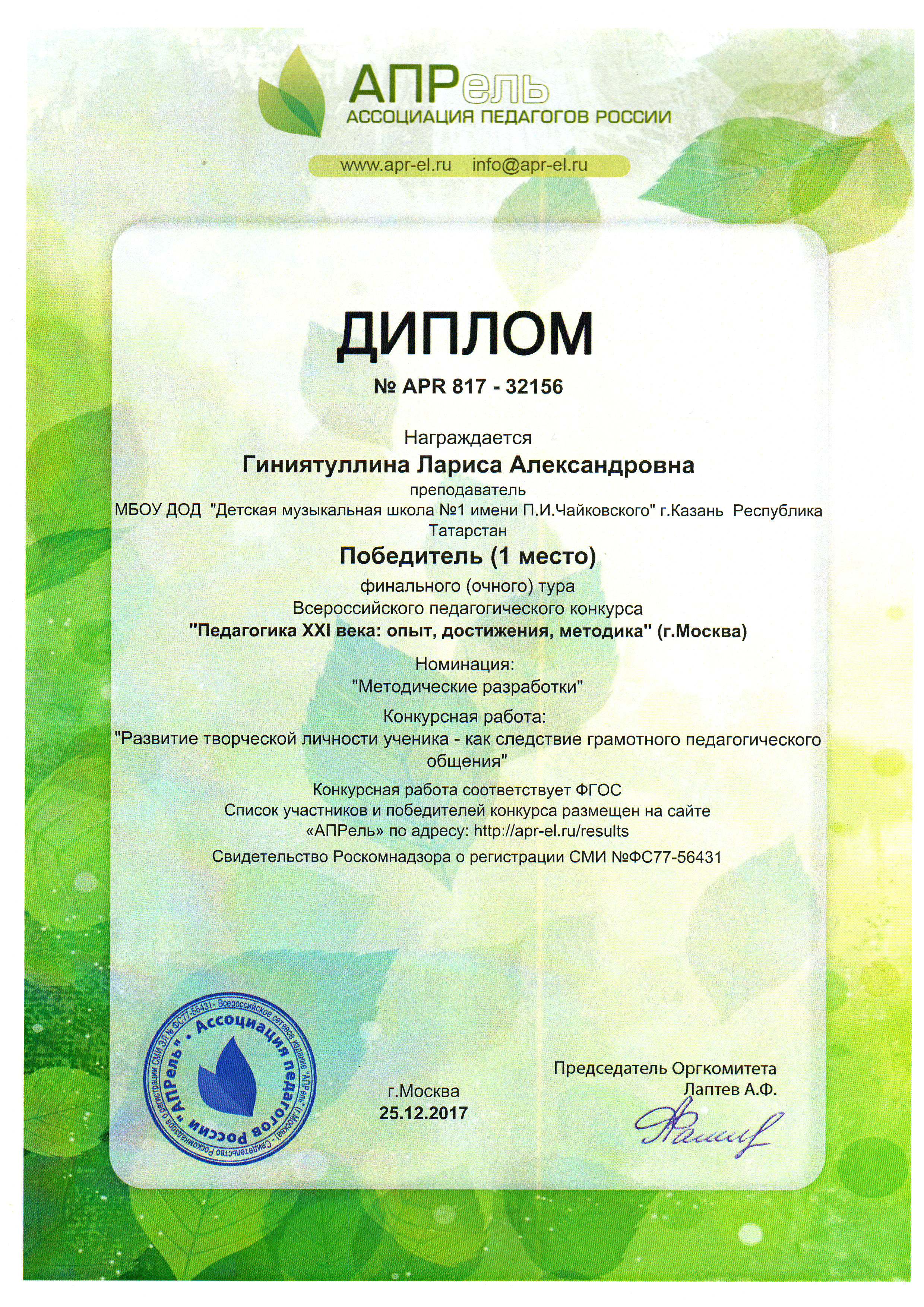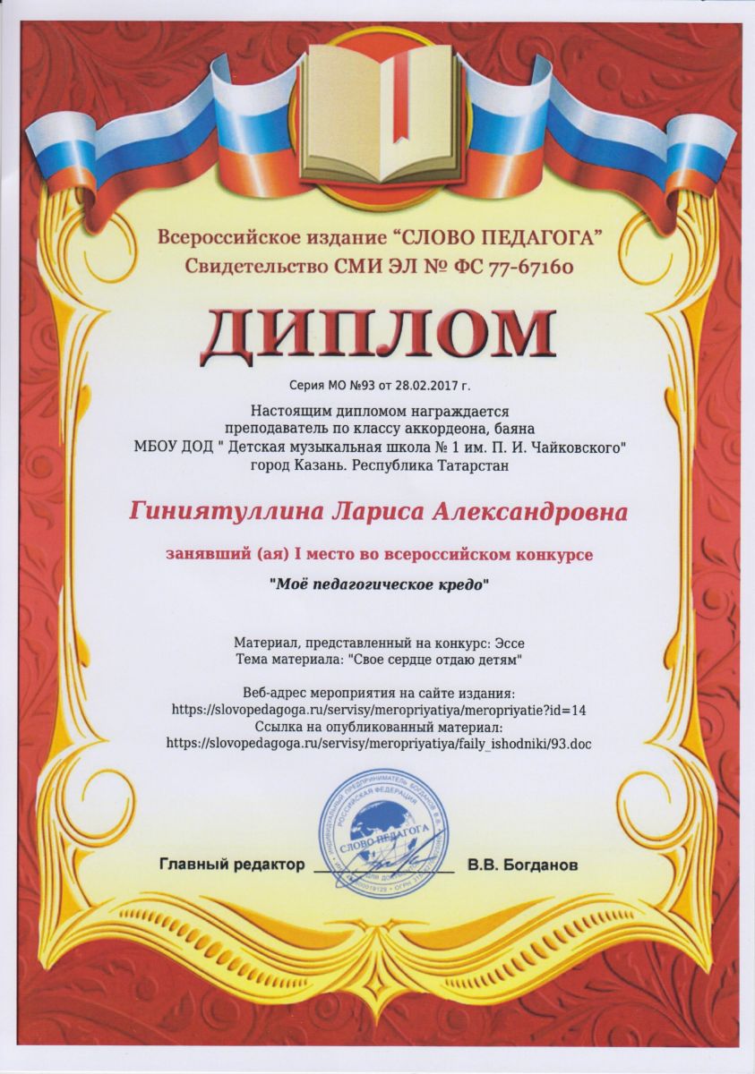 Всероссийский конкурс "Моё педагогическое кредо" - Гиниятуллина Л.А., I место;
