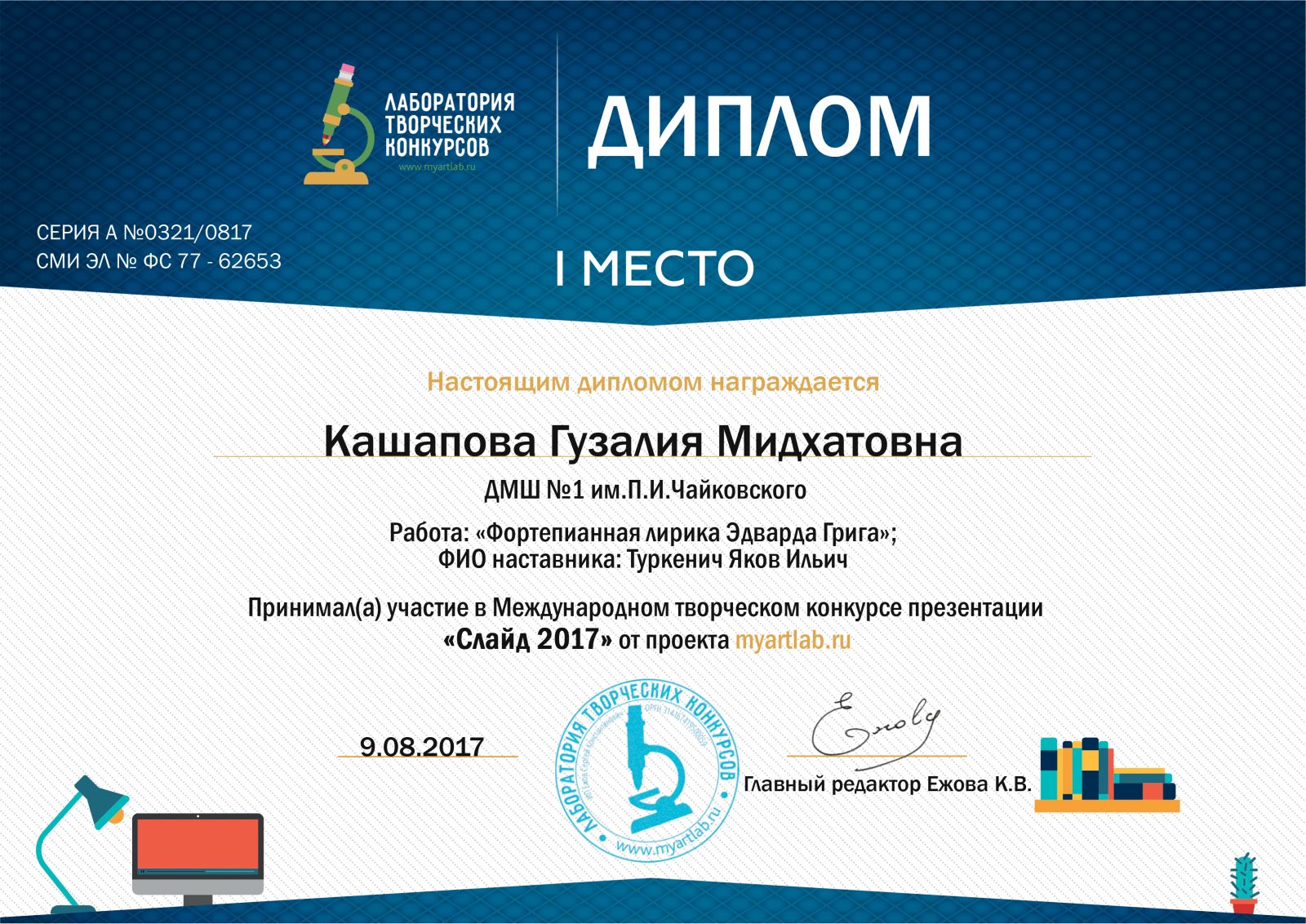 Международный творческий конкурс презентации "Слайд-2017" - Кашапова Г.М., Диплом I место;