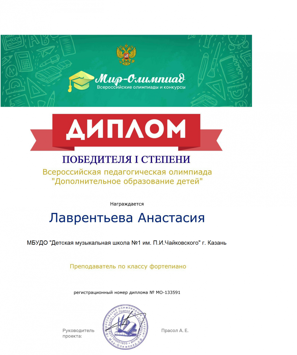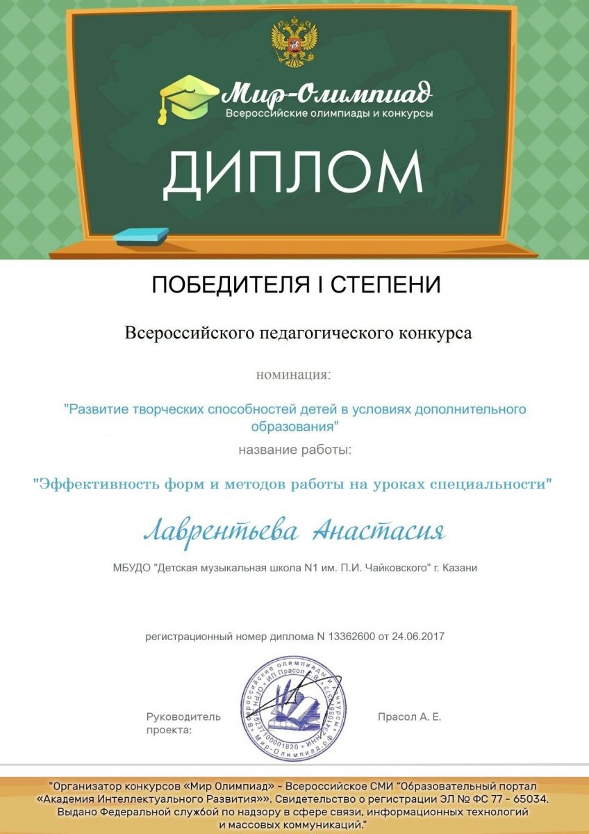 Всероссийская педагогический конкурс - Лаврентьева А.И., Диплом Победителя I степени;