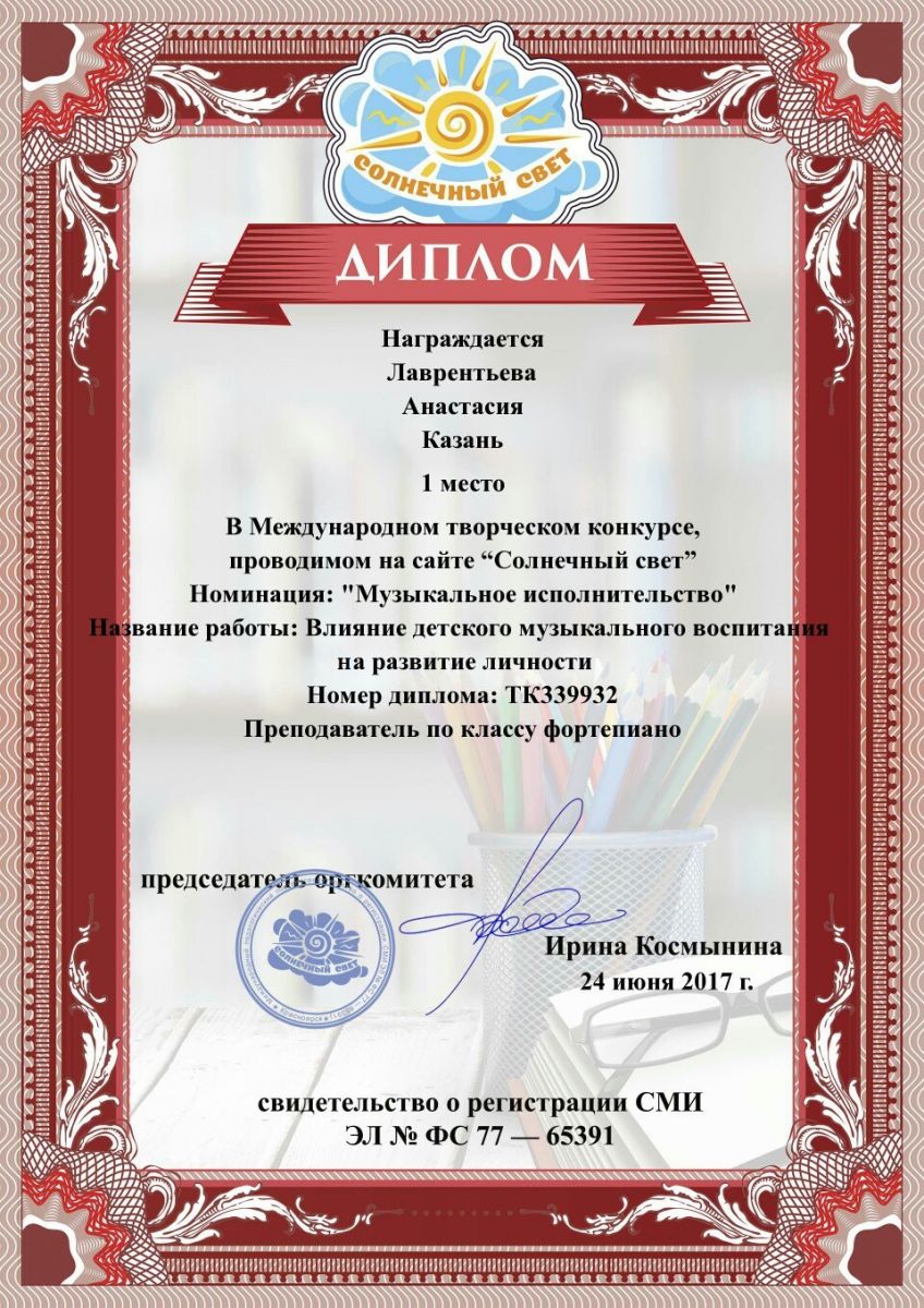 Международный творческий конкурс "Солнечный свет" - Лаврентьева А.И., Диплом I место;