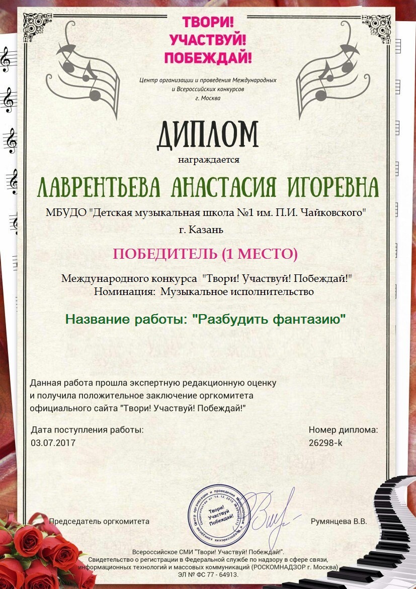 Международный конкурс "Твори! Участвуй! Побеждай!" - Лаврентьева А.И., Диплом, Победитель, I место;