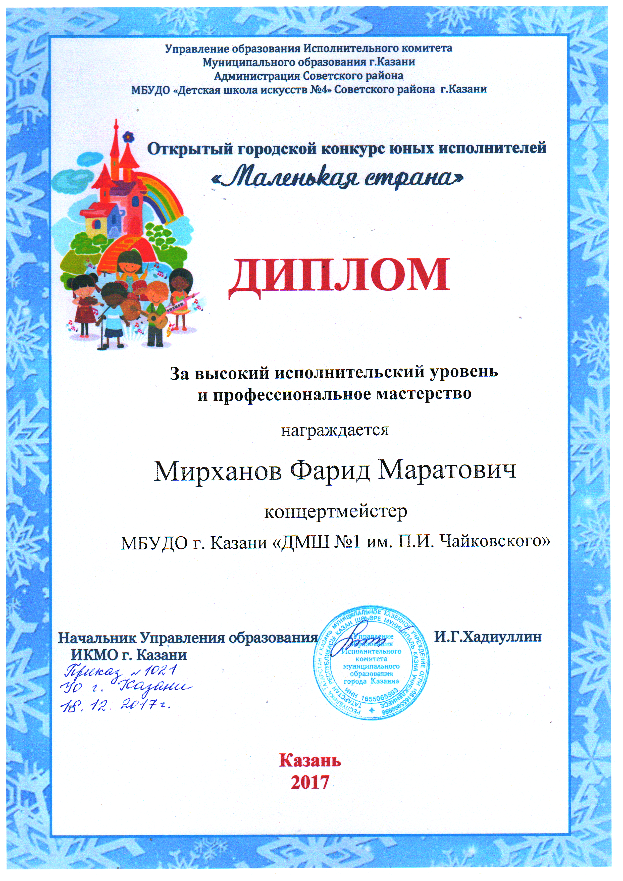 Открытый городской конкурс юных исполнителей "Маленькая страна" - Мирханов Ф.М., Диплом;