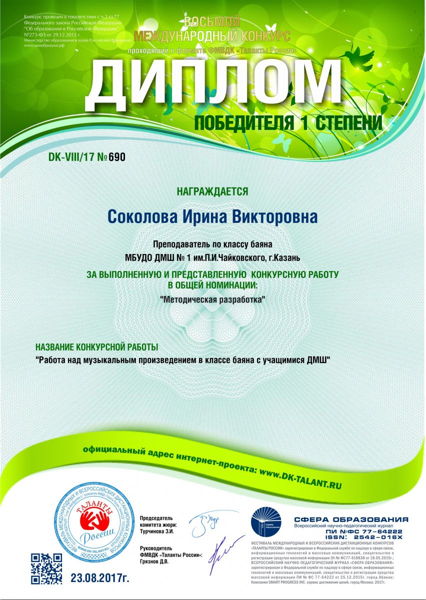 VIII Международный конкурс "Таланты России" - Соколова И.В., Диплом Победителя I степени;