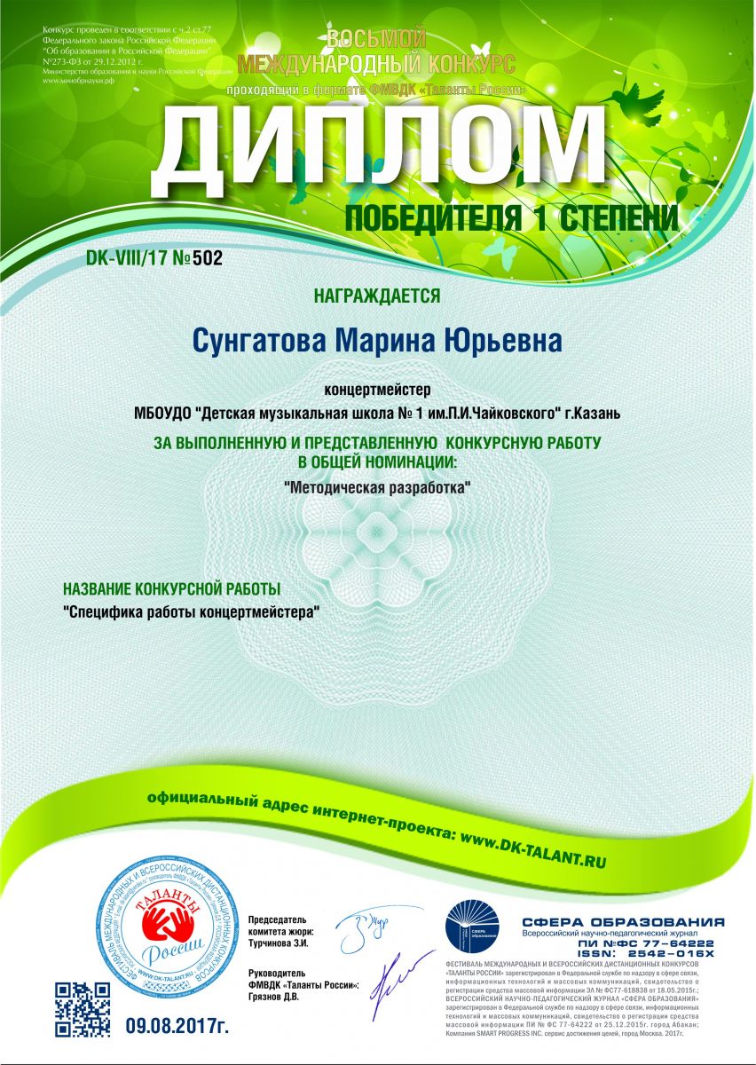 VIII Международный конкурс "Таланты России" - Сунгатова М.Ю., Диплом Победителя I степени;