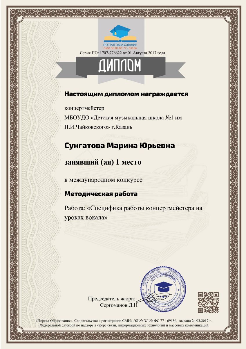 Международный конкурс Портала "Образование" - Сунгатова М.Ю., I место;