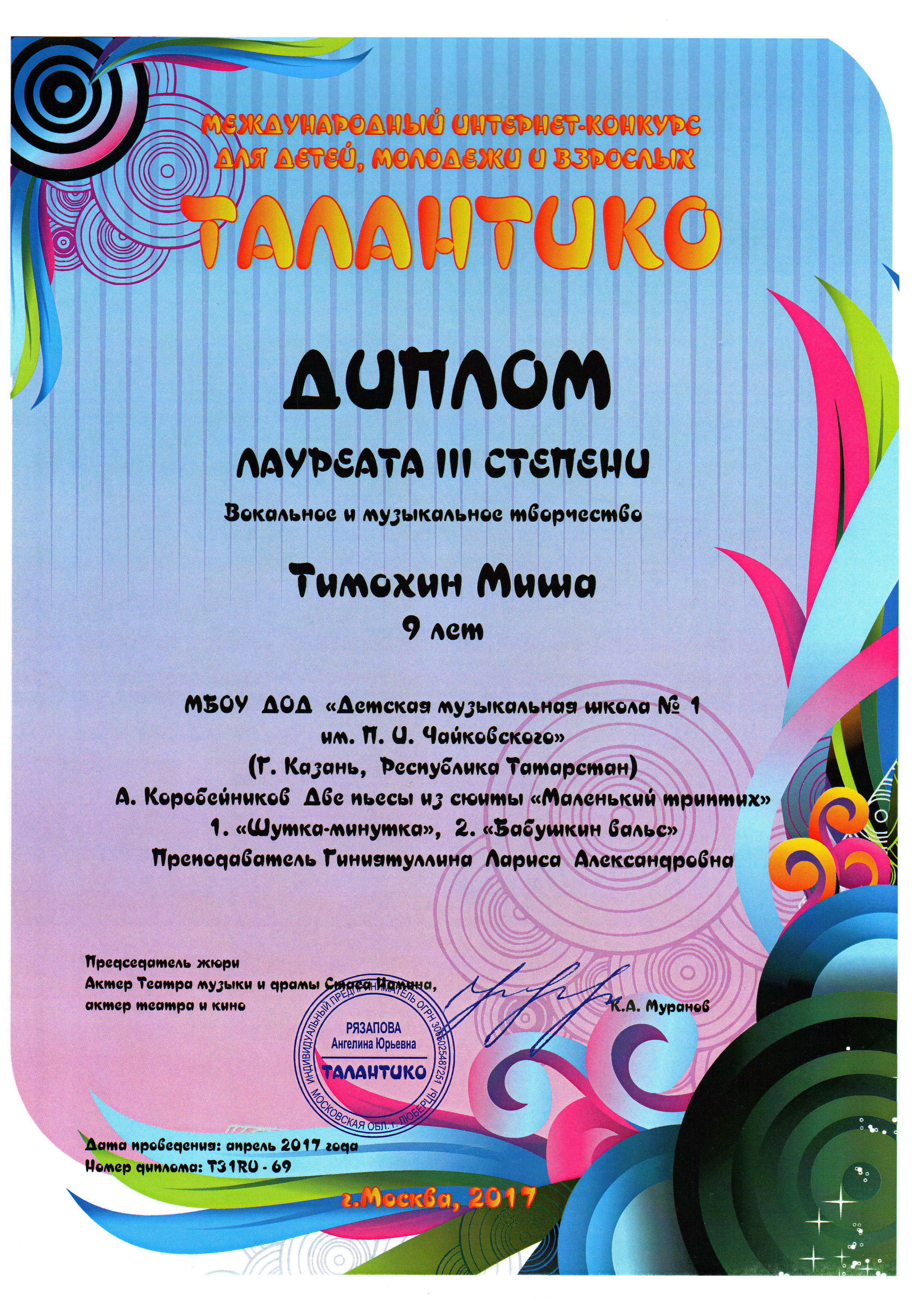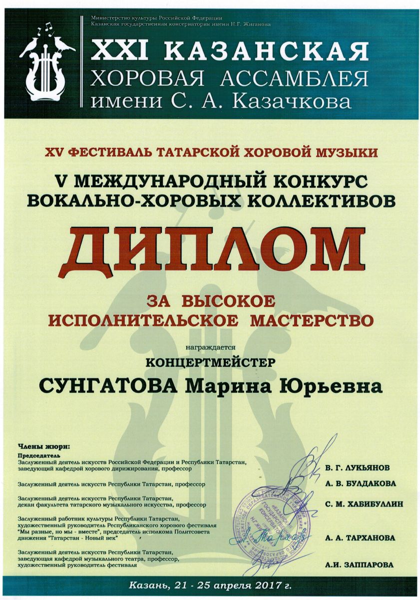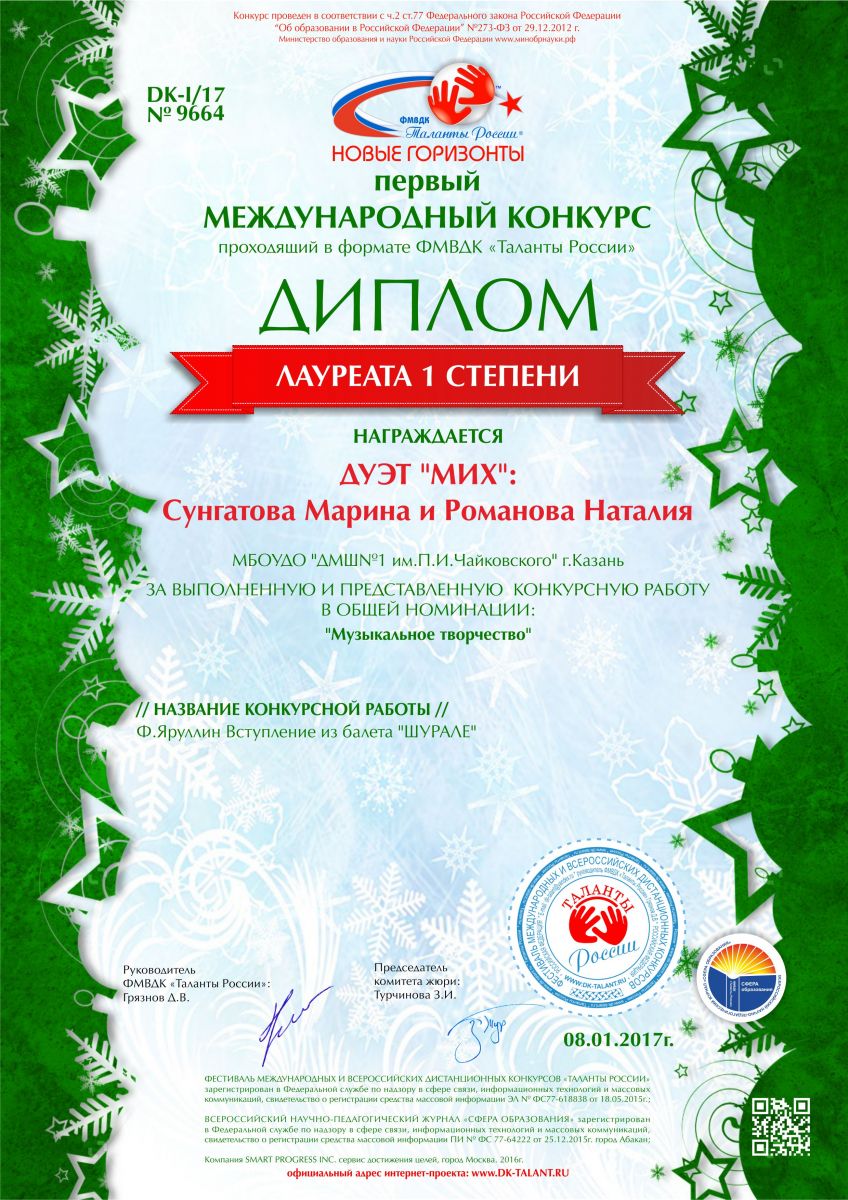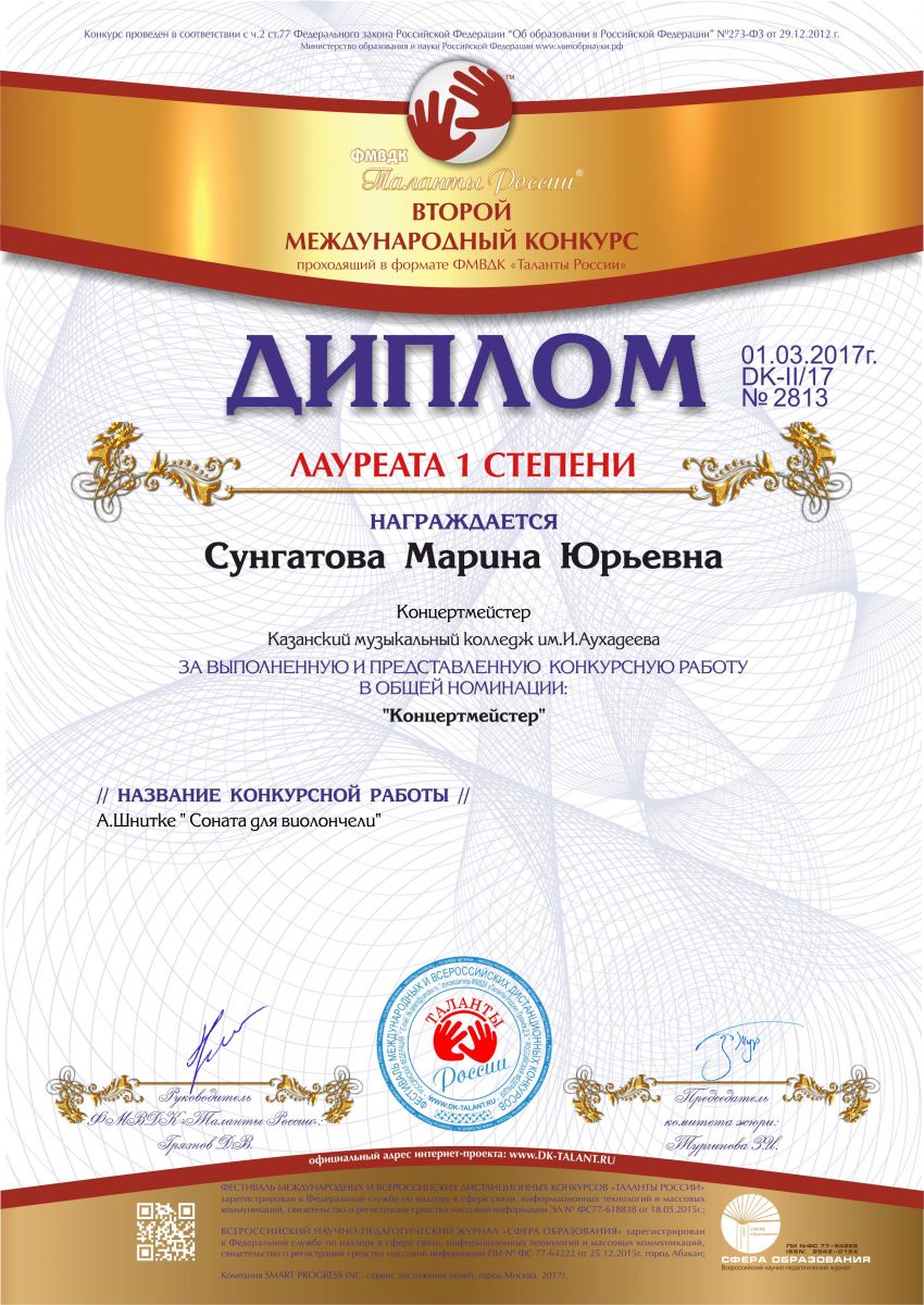 Второй Международный конкурс "Таланты России" - Сунгатова М.Ю., Лауреат I степени;