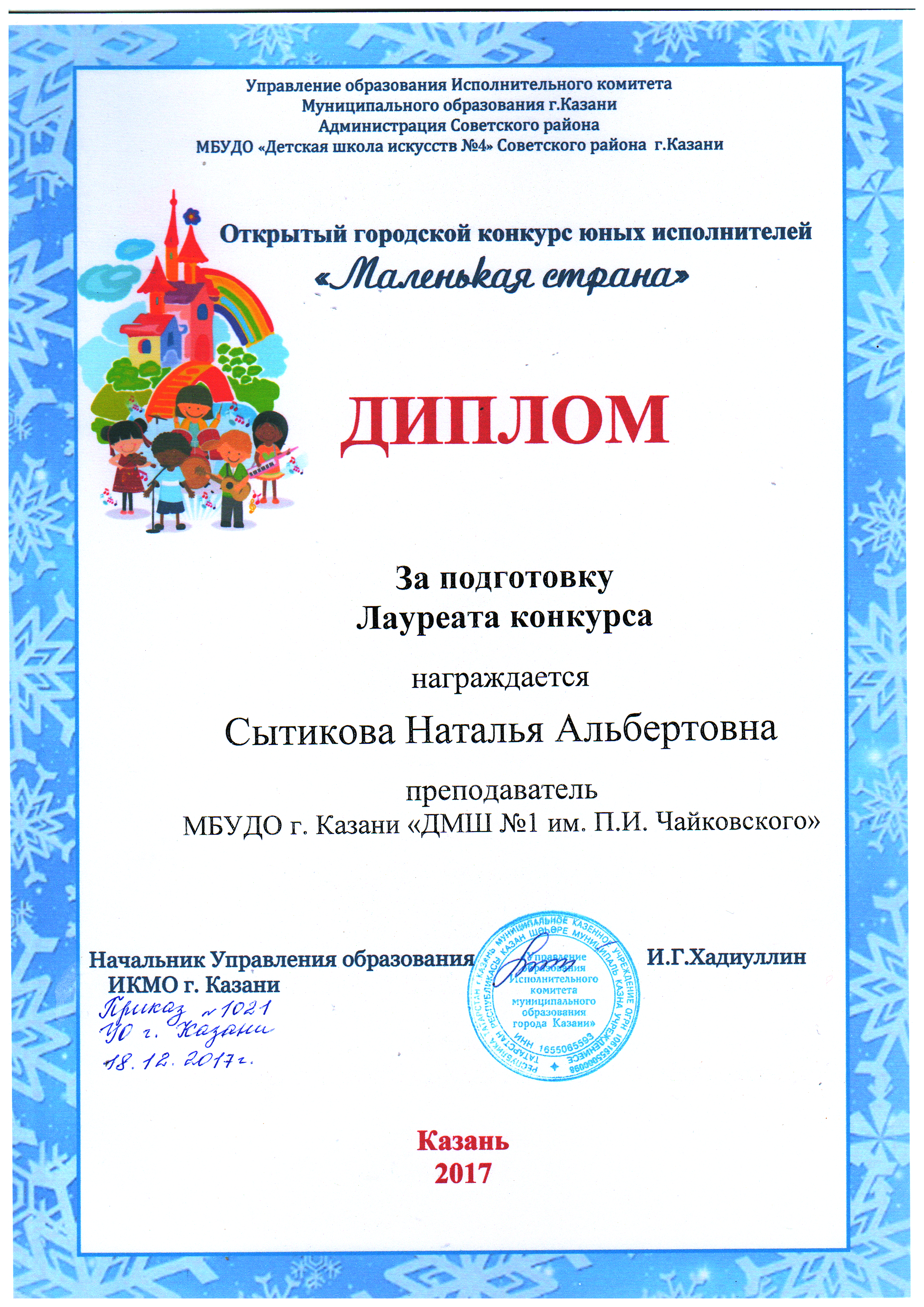 Открытый городской конкурс юных исполнителей "Маленькая страна" - Сытикова Н.А., Диплом;