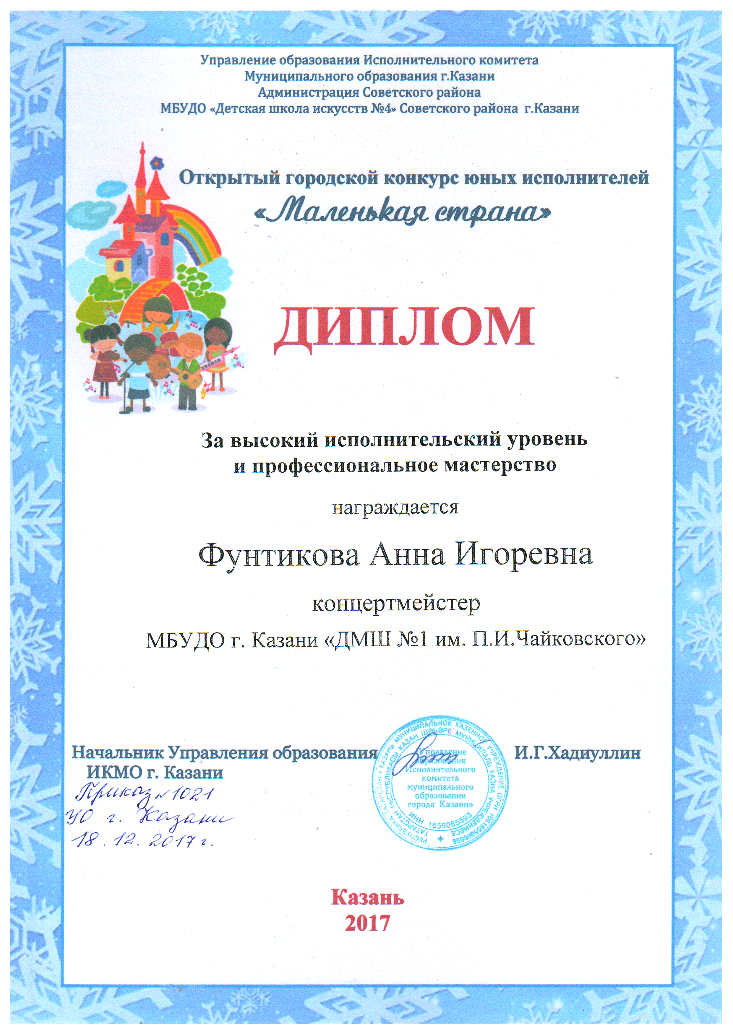 Открытый городской конкурс юных исполнителей "Маленькая страна" - Фунтикова А.И., Диплом;