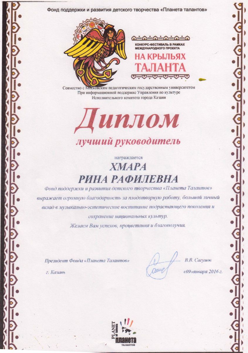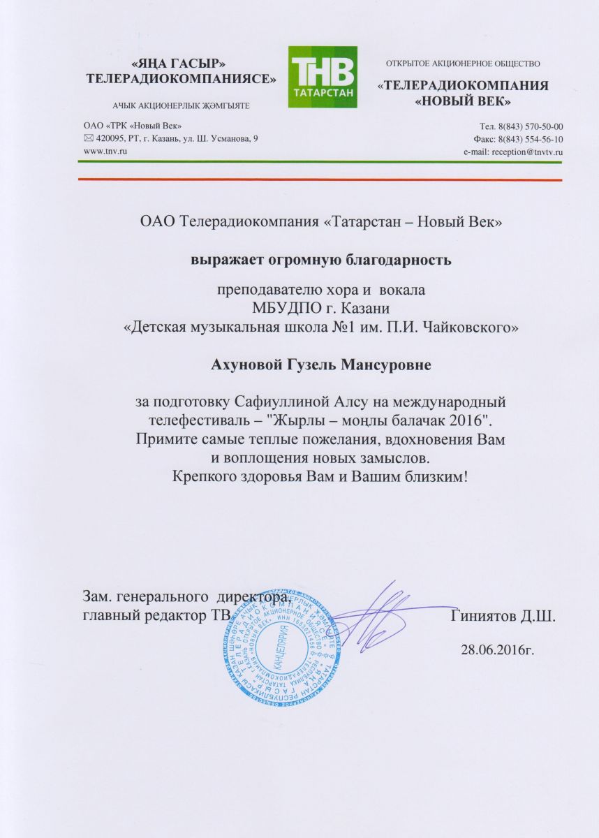 Международный телефестиваль "Жырлы - моңлы балачак 2016" - Ахунова Г.М.;