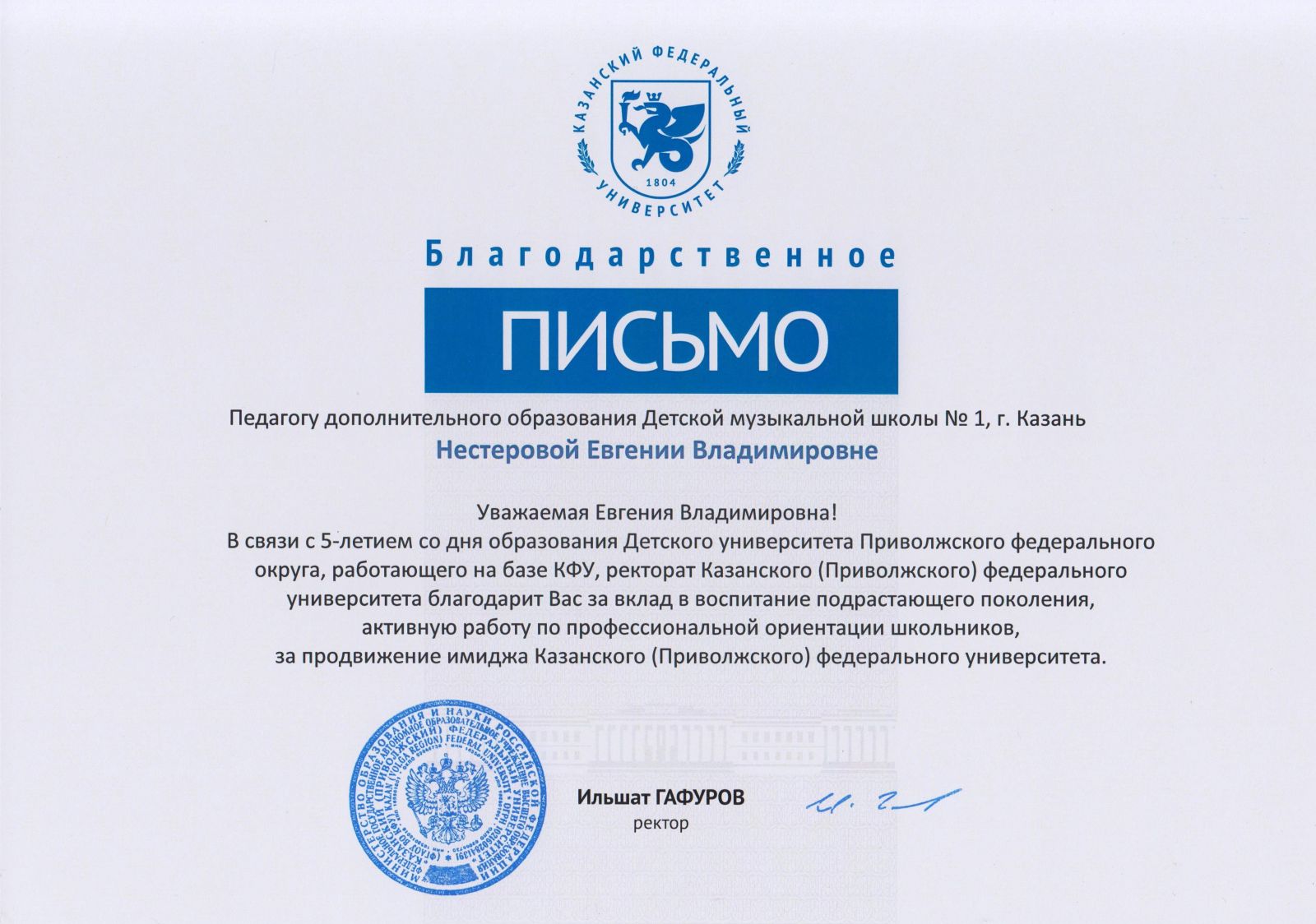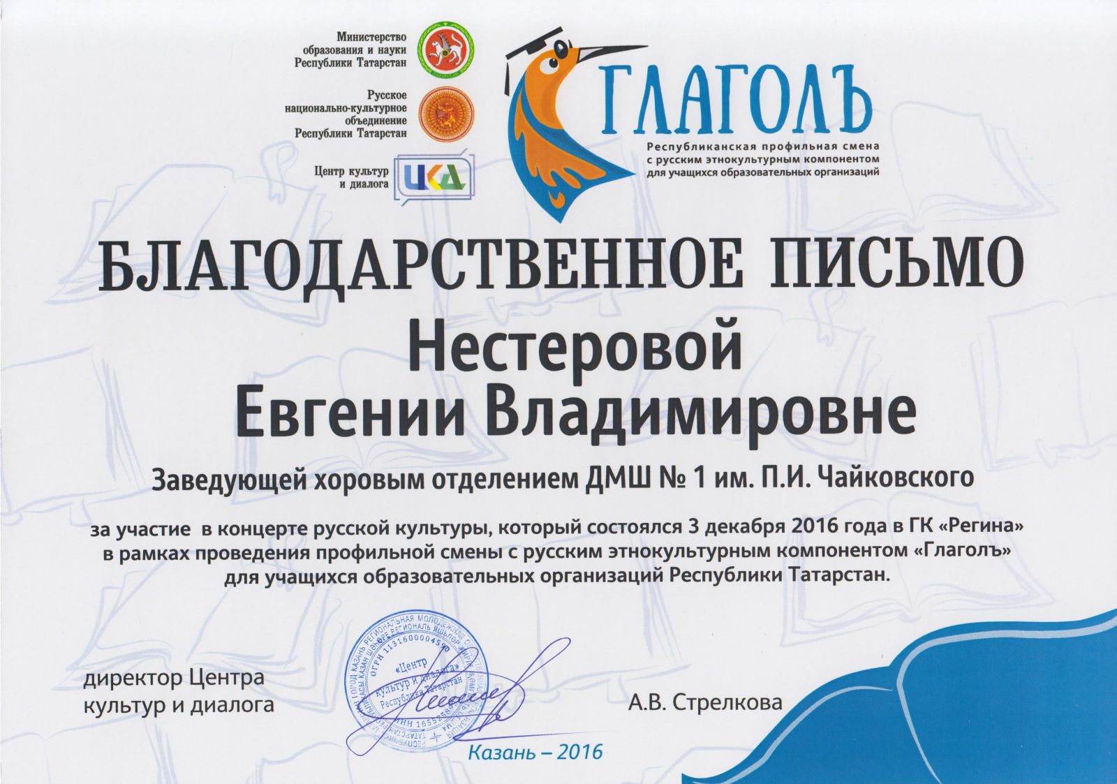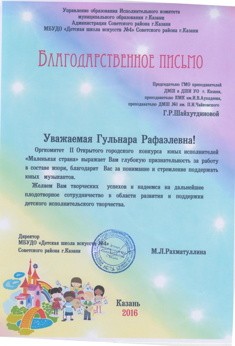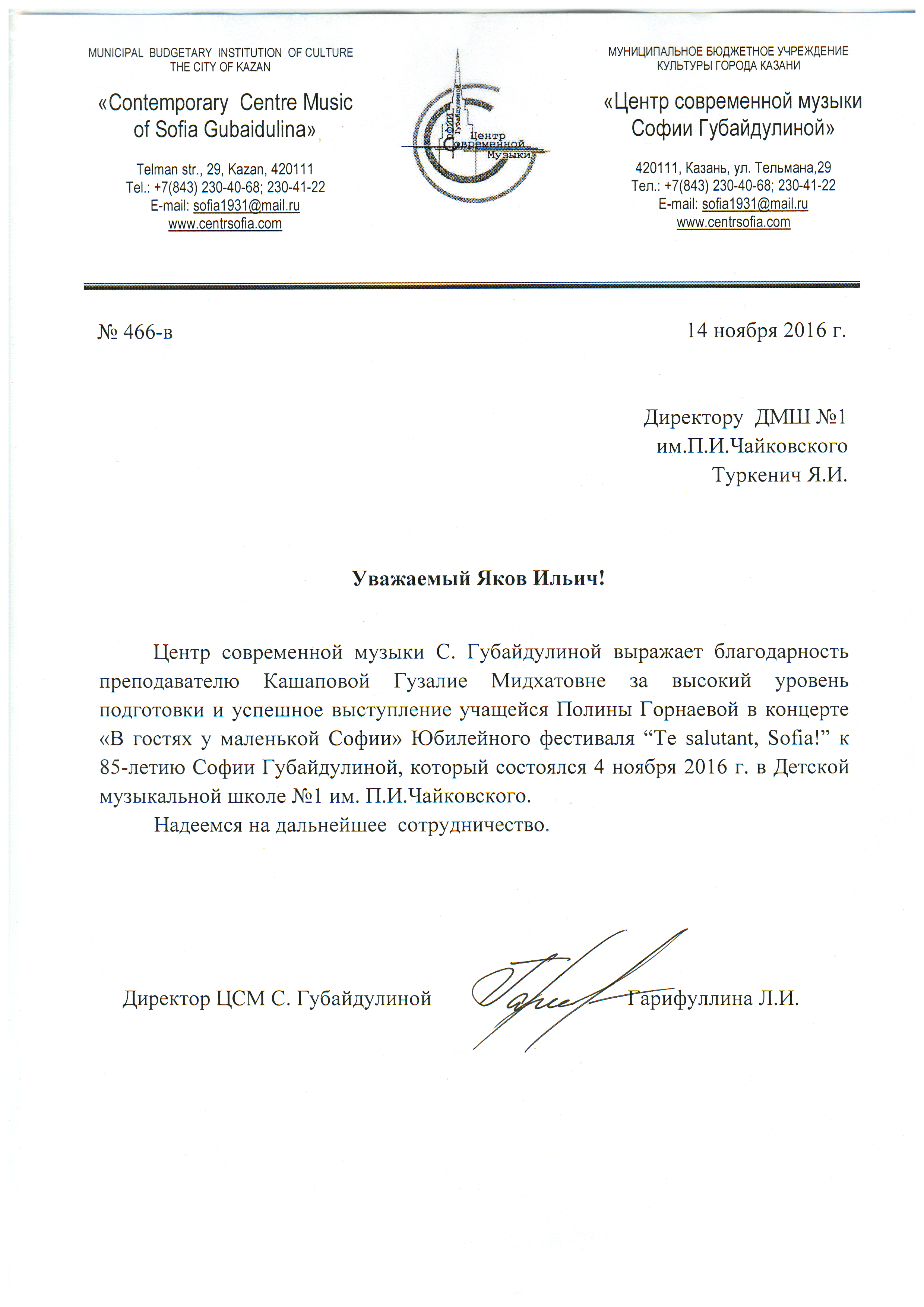 Центр современной музыки Софии Губайдулиной - Кашапова Г.М., Благодарственное письмо.
