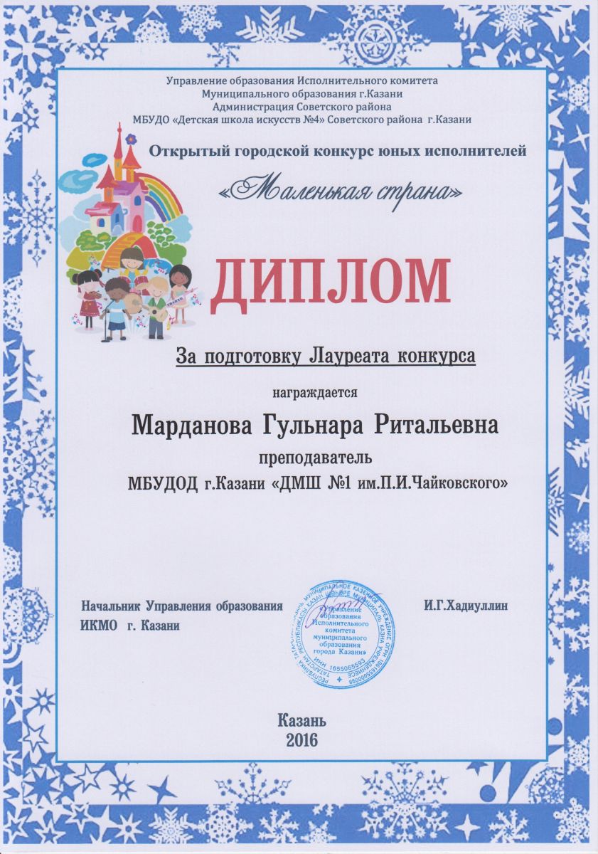 Открытый городской конкурс юных исполнителей "Маленькая страна" - Марданова Г.Р.;