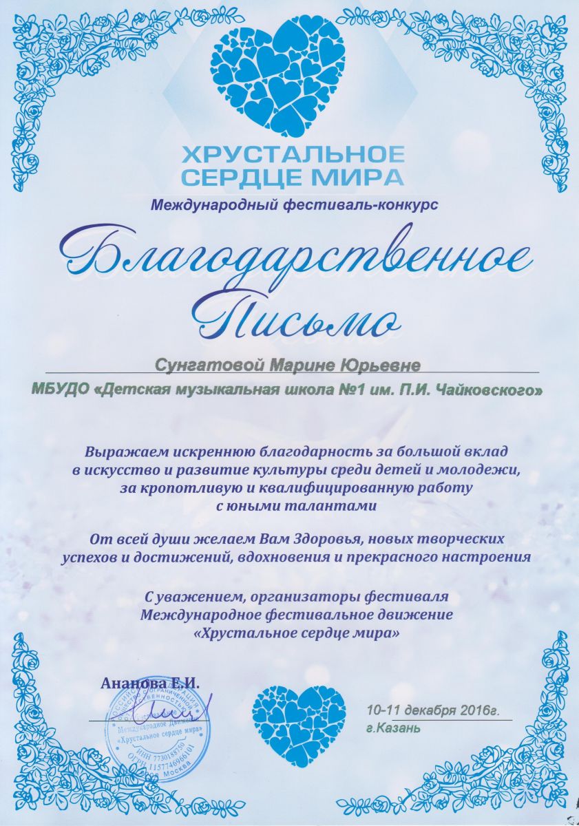 Международный фестиваль-конкурс "Хрустальное сердце мира" - Сунгатова М.Ю.;