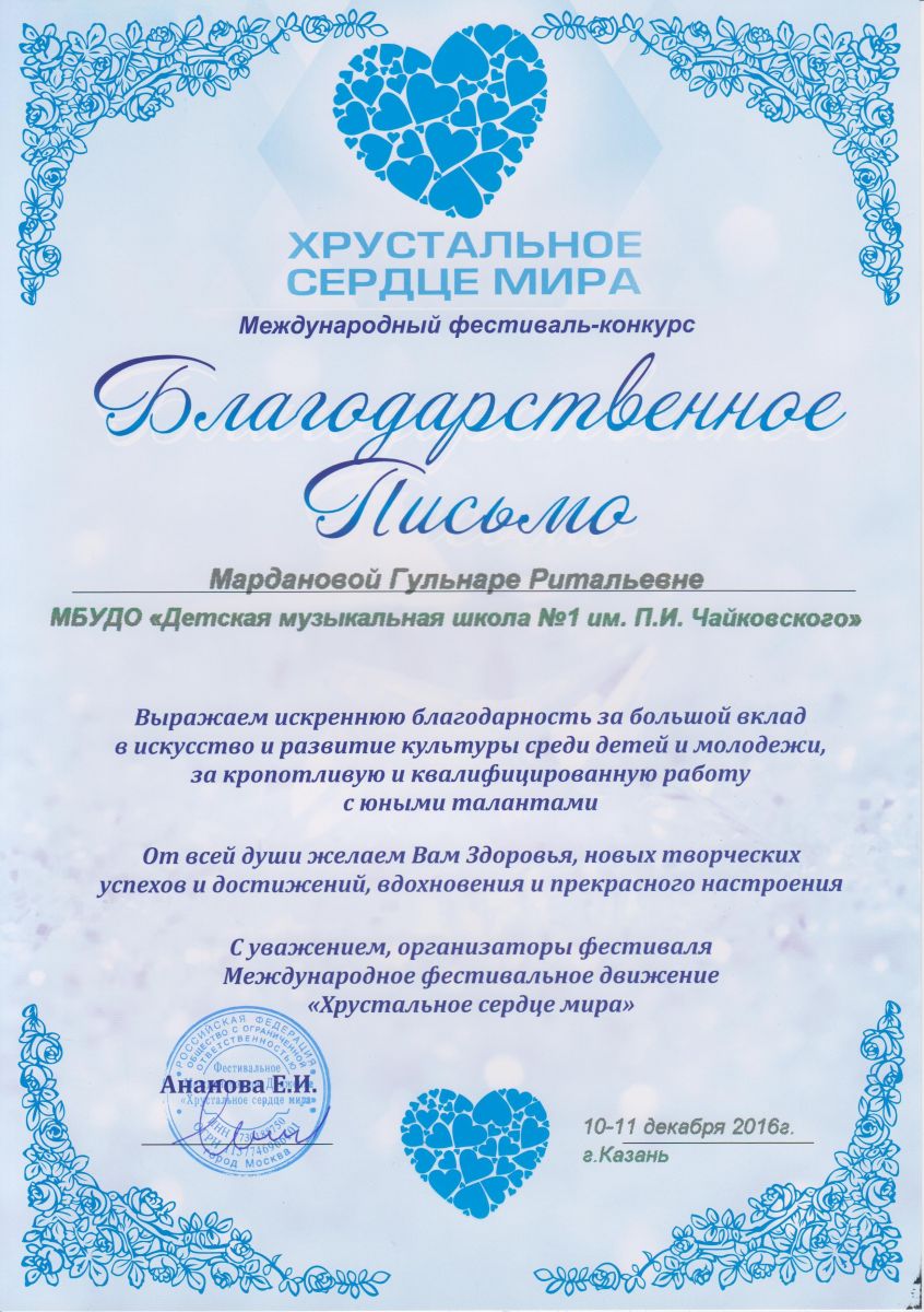 Международный фестиваль-конкурс "Хрустальное сердце мира" - Марданова Г.Р.;