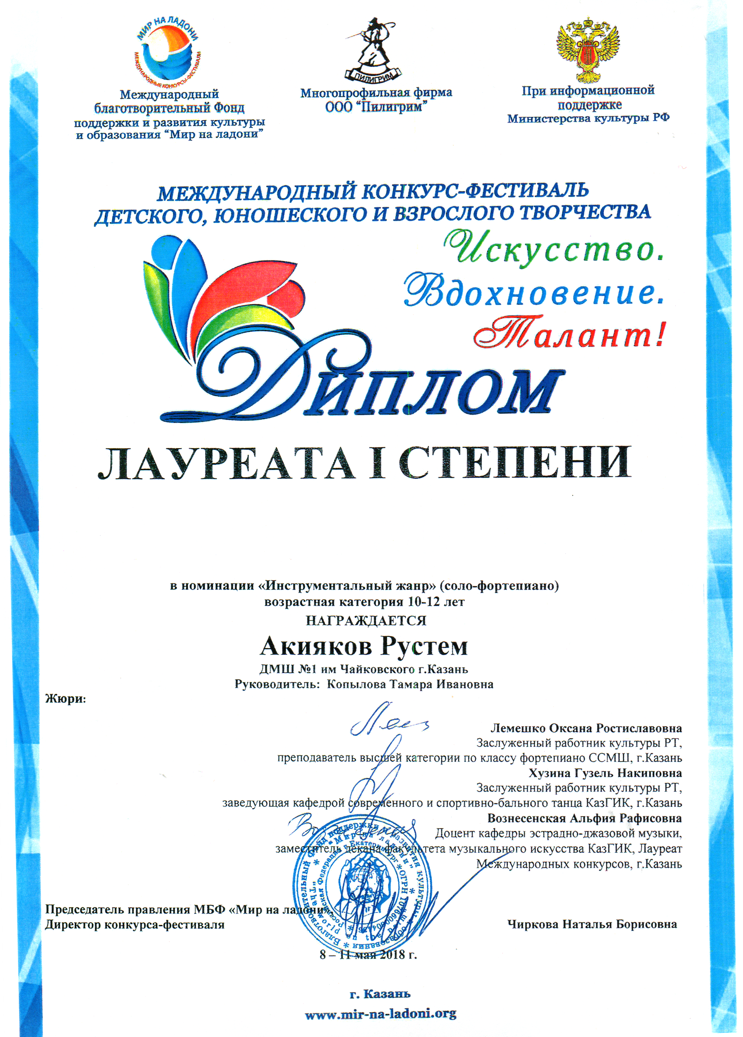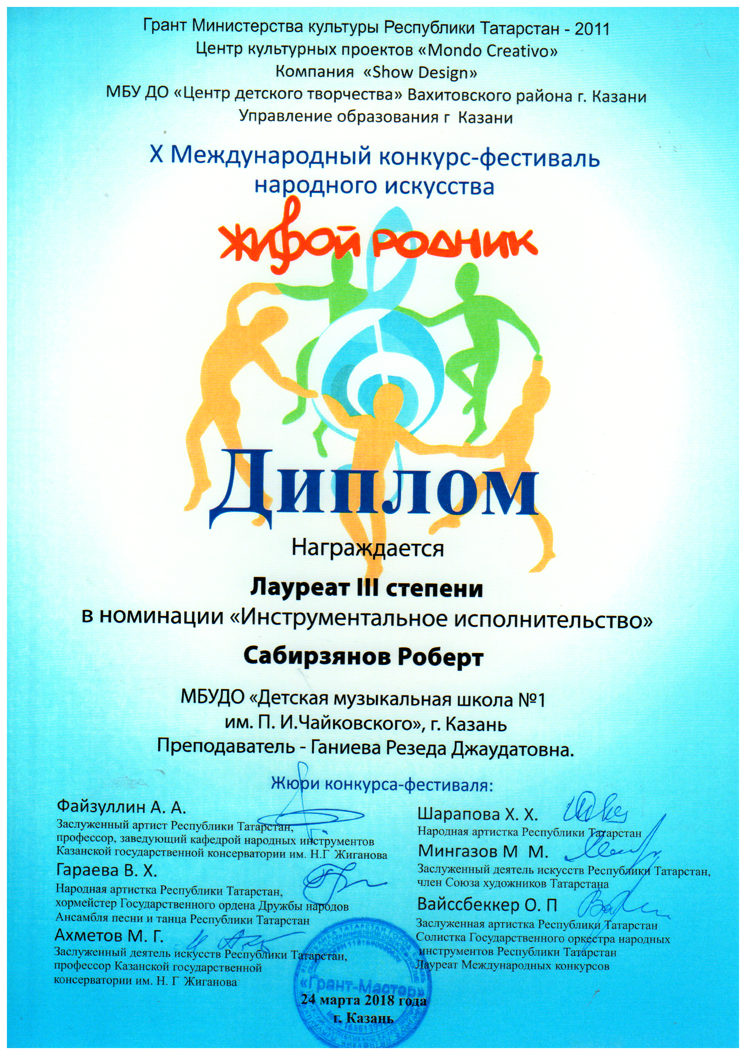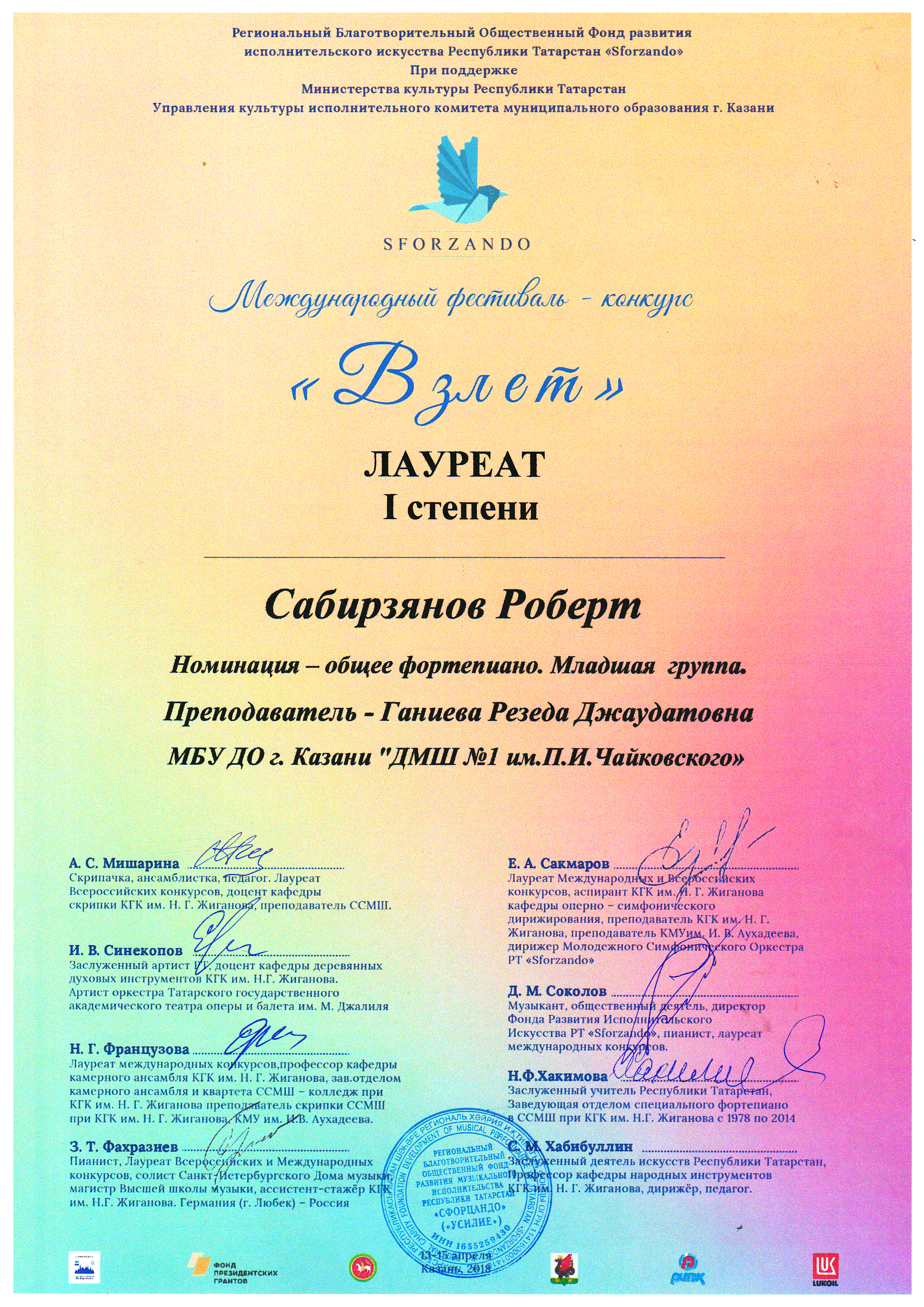 Международный фестиваль-конкурс "Взлёт" - Сабирзянов Роберт, Лауреат I степени;
