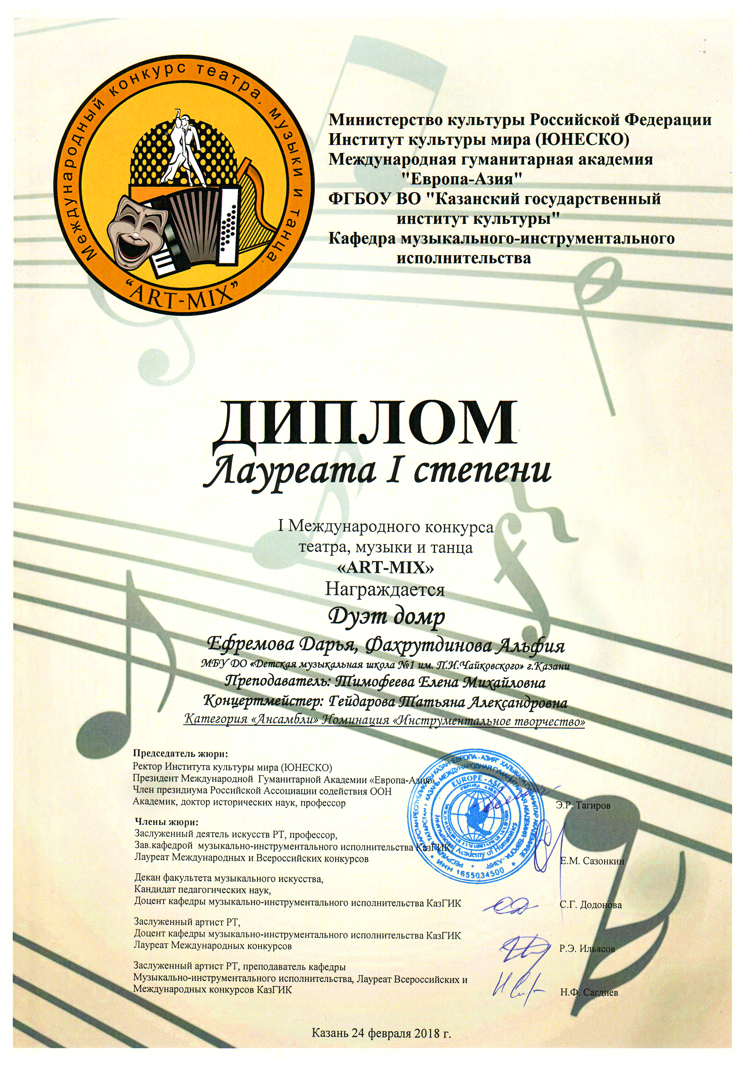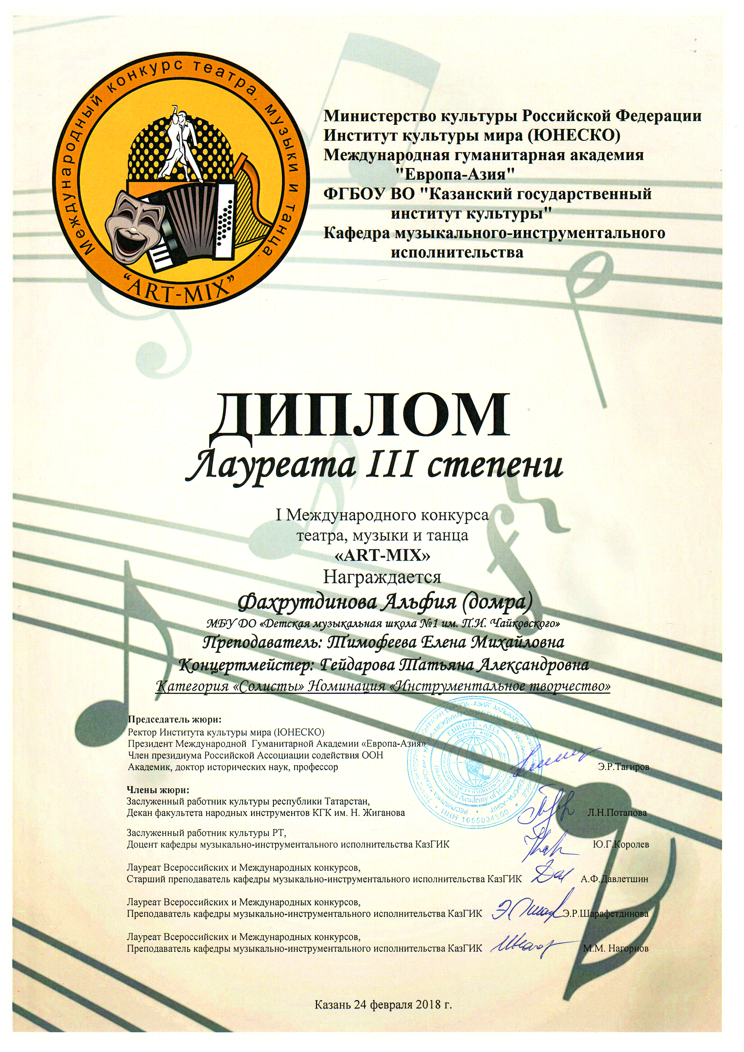 I Международный конкурс театра, музыки и танца "ART-MIX" - Фахрутдинова Альфия, Лауреат III степени;