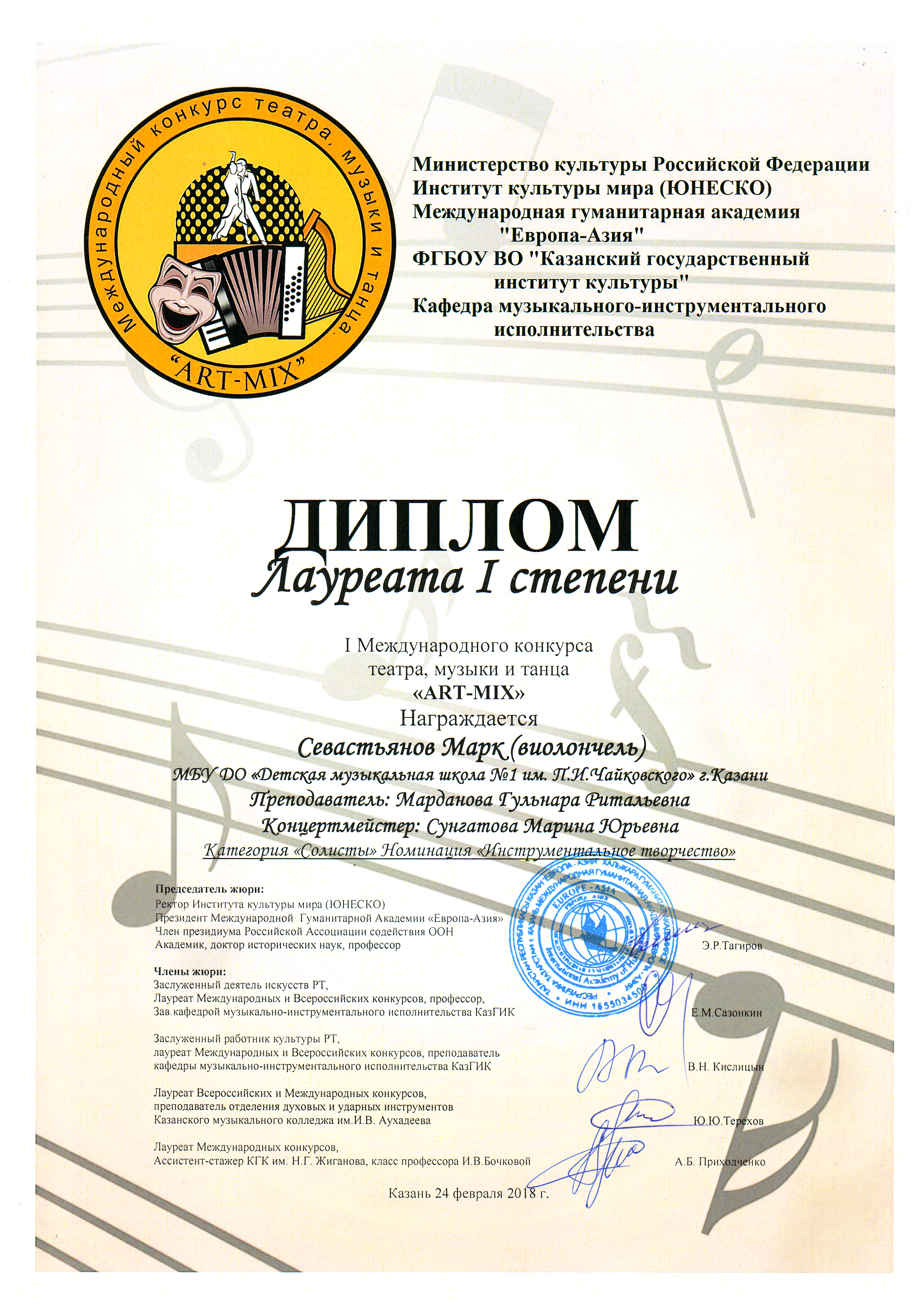 I Международный конкурс театра, музыки и танца "ART-MIX" - Севастьянов Марк, Лауреат I степени;
