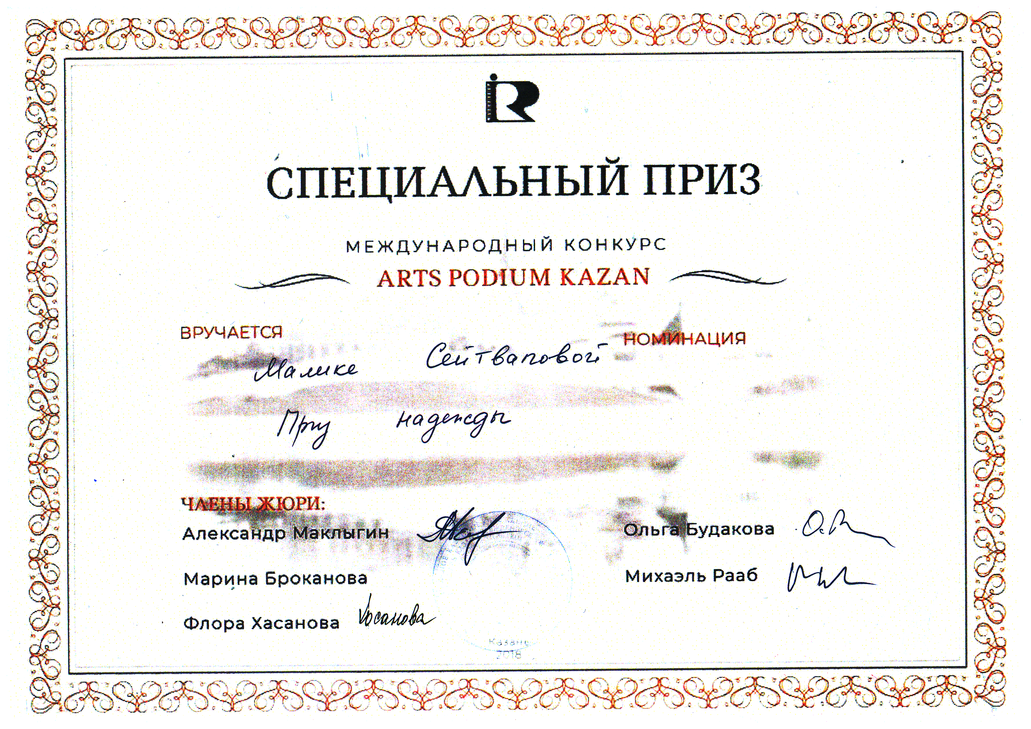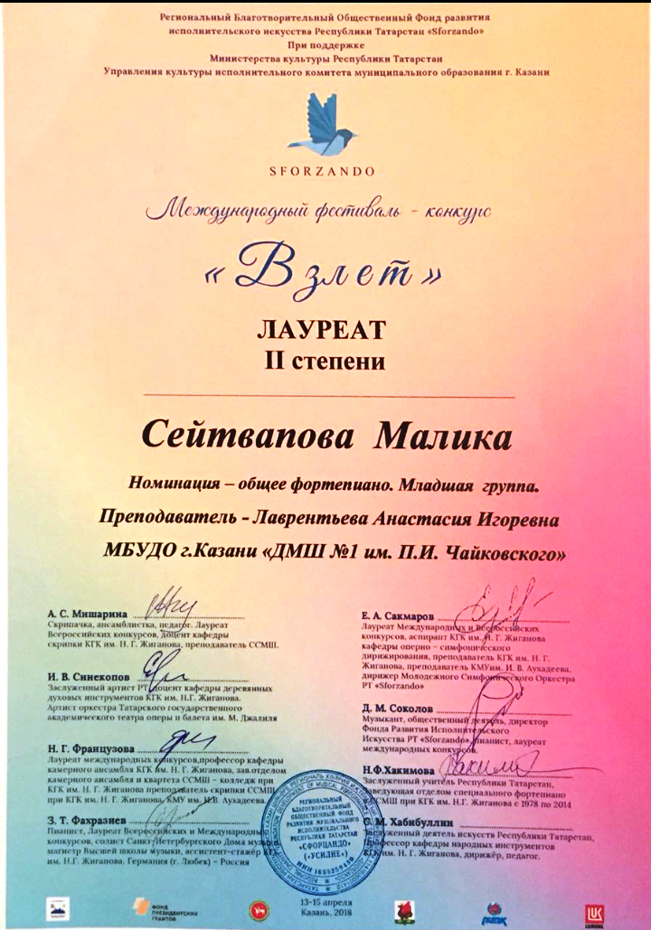 Международный фестиваль-конкурс "Взлёт" - Сейтвапова Малика, Лауреат II степени;