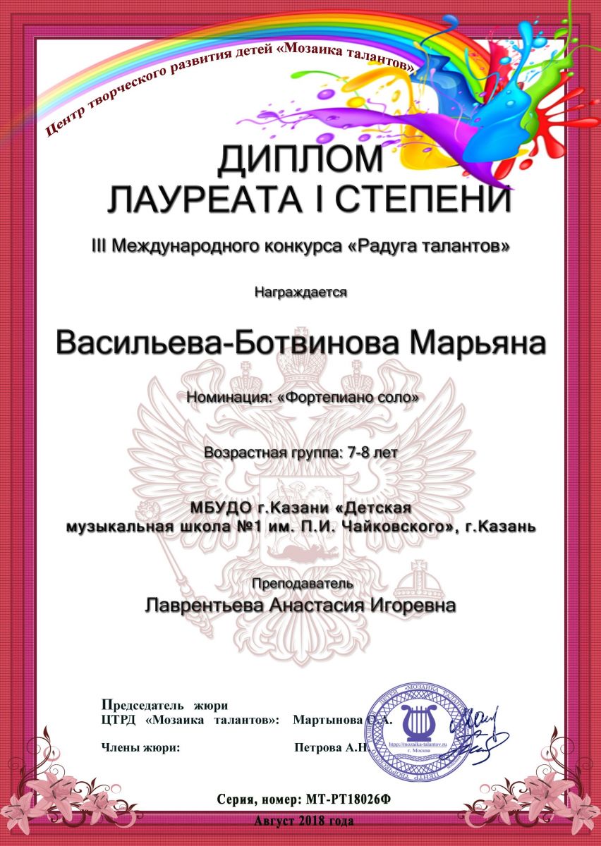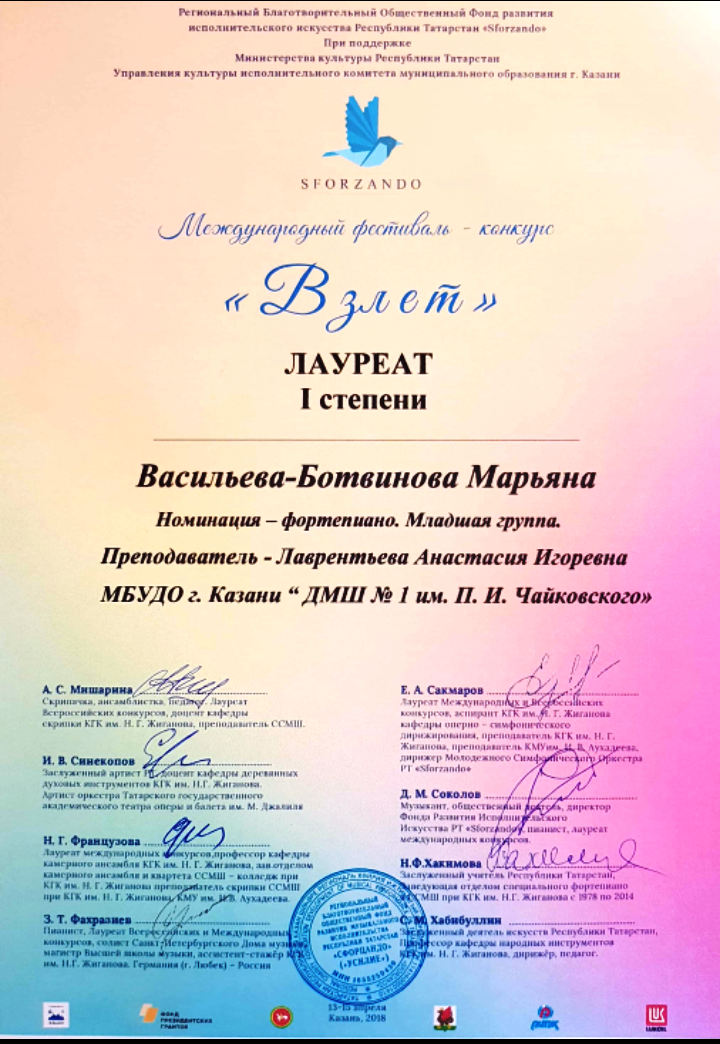 Международный фестиваль-конкурс "Взлёт" - Васильева-Ботвинова Марьяна, Лауреат I степени;