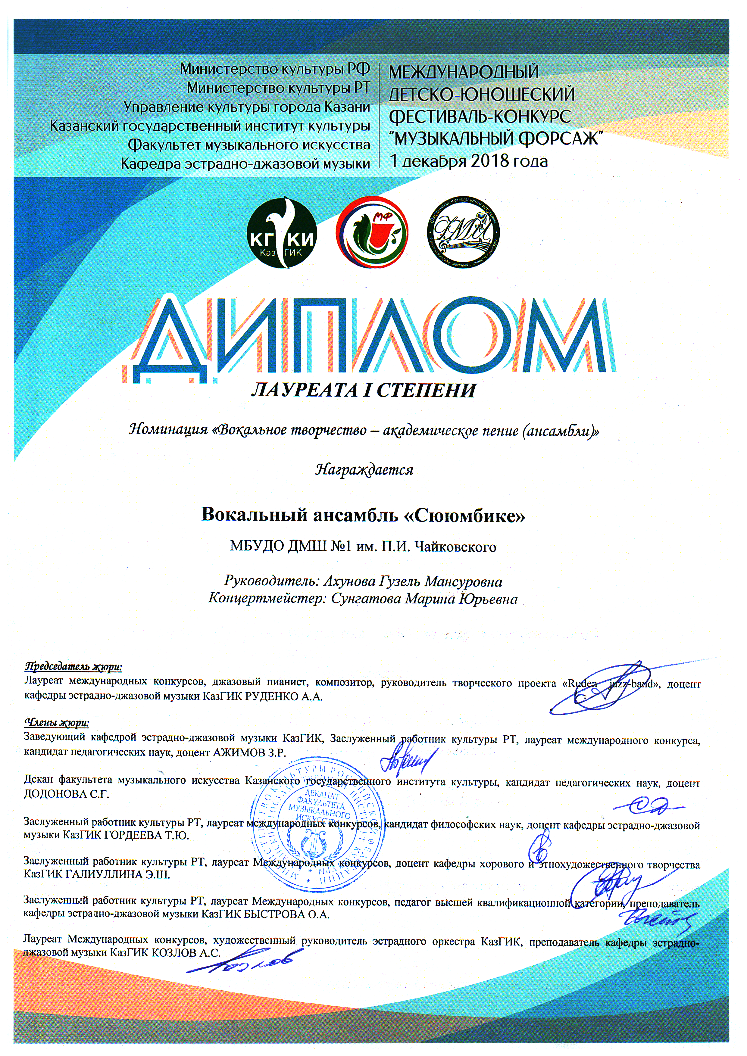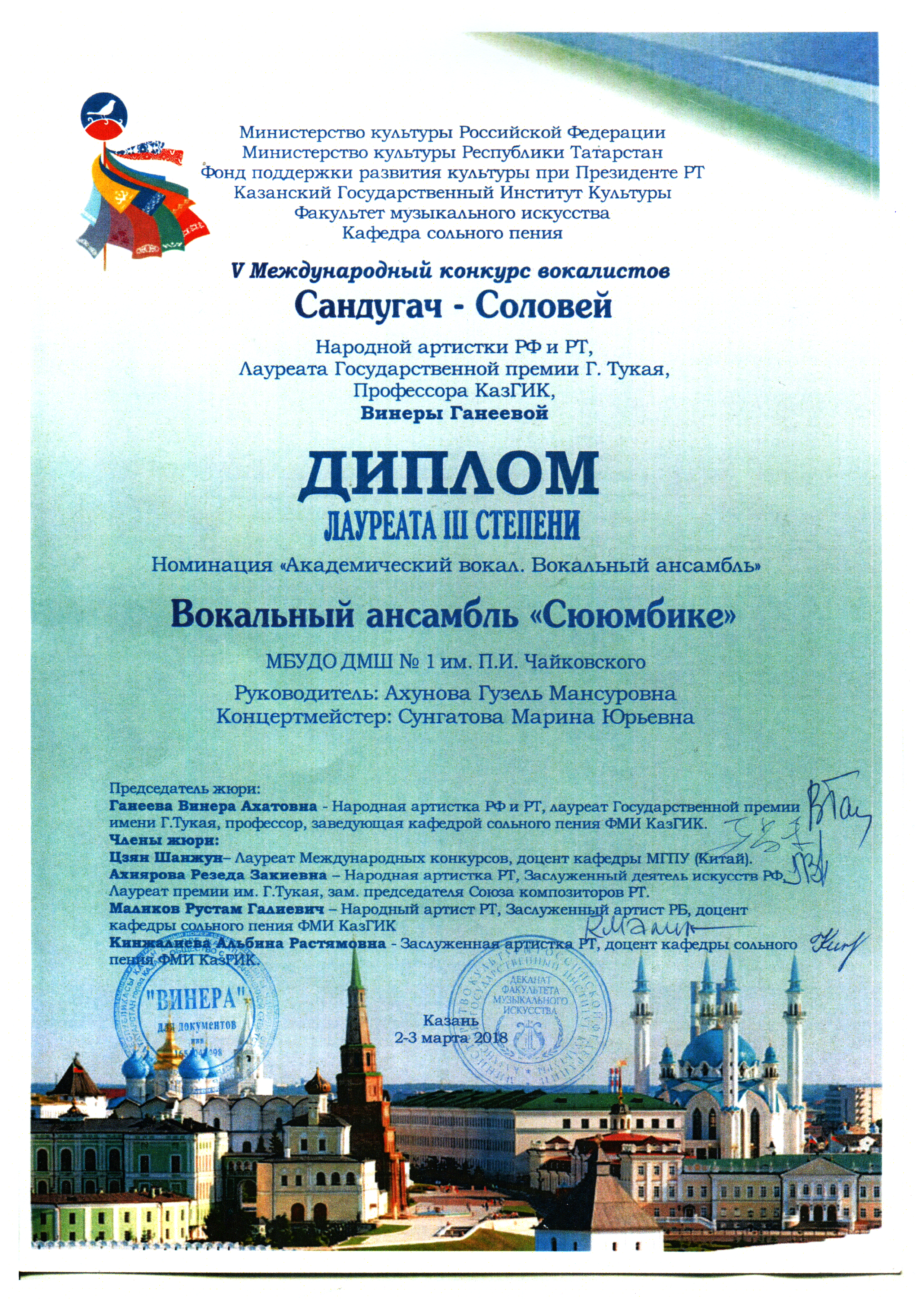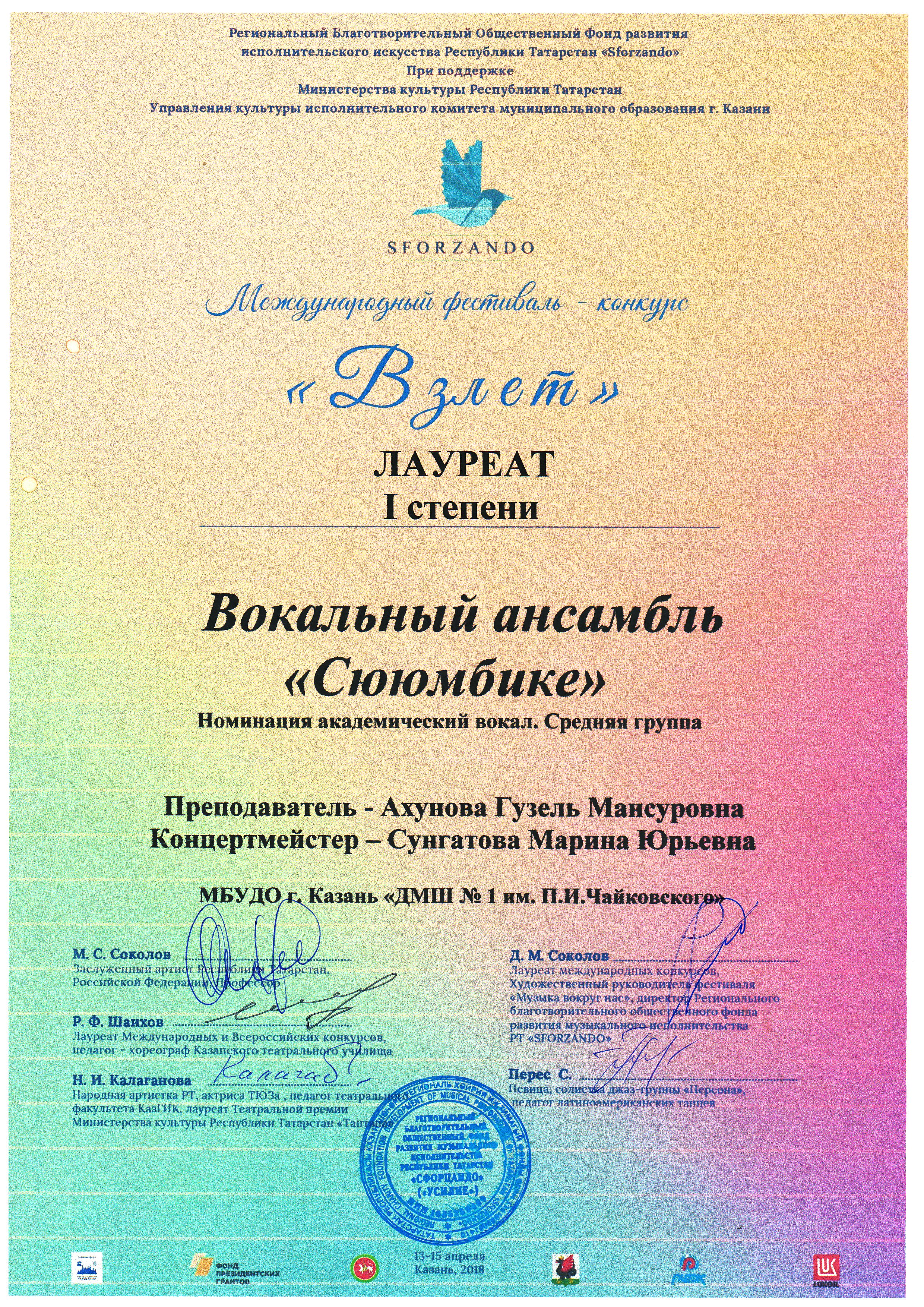Международный фестиваль-конкурс "Взлёт" - вокальный ансамбль "Сююмбике", Лауреат I степени;