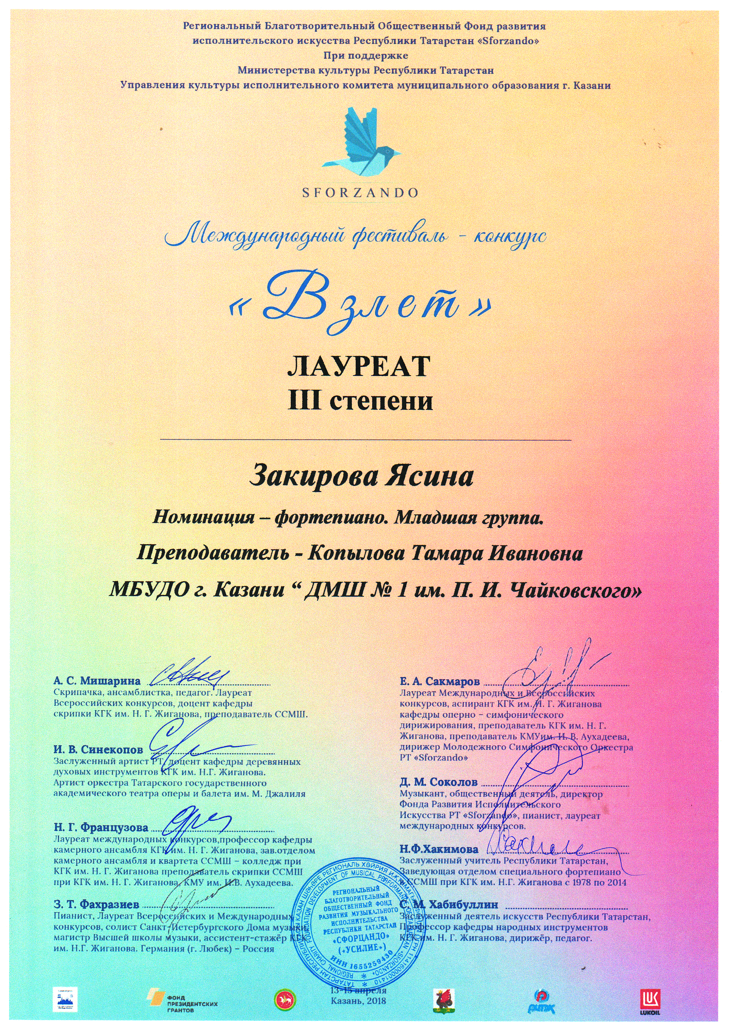 Международный фестиваль-конкурс "Взлёт" - Закирова Ясина, Лауреат III степени;