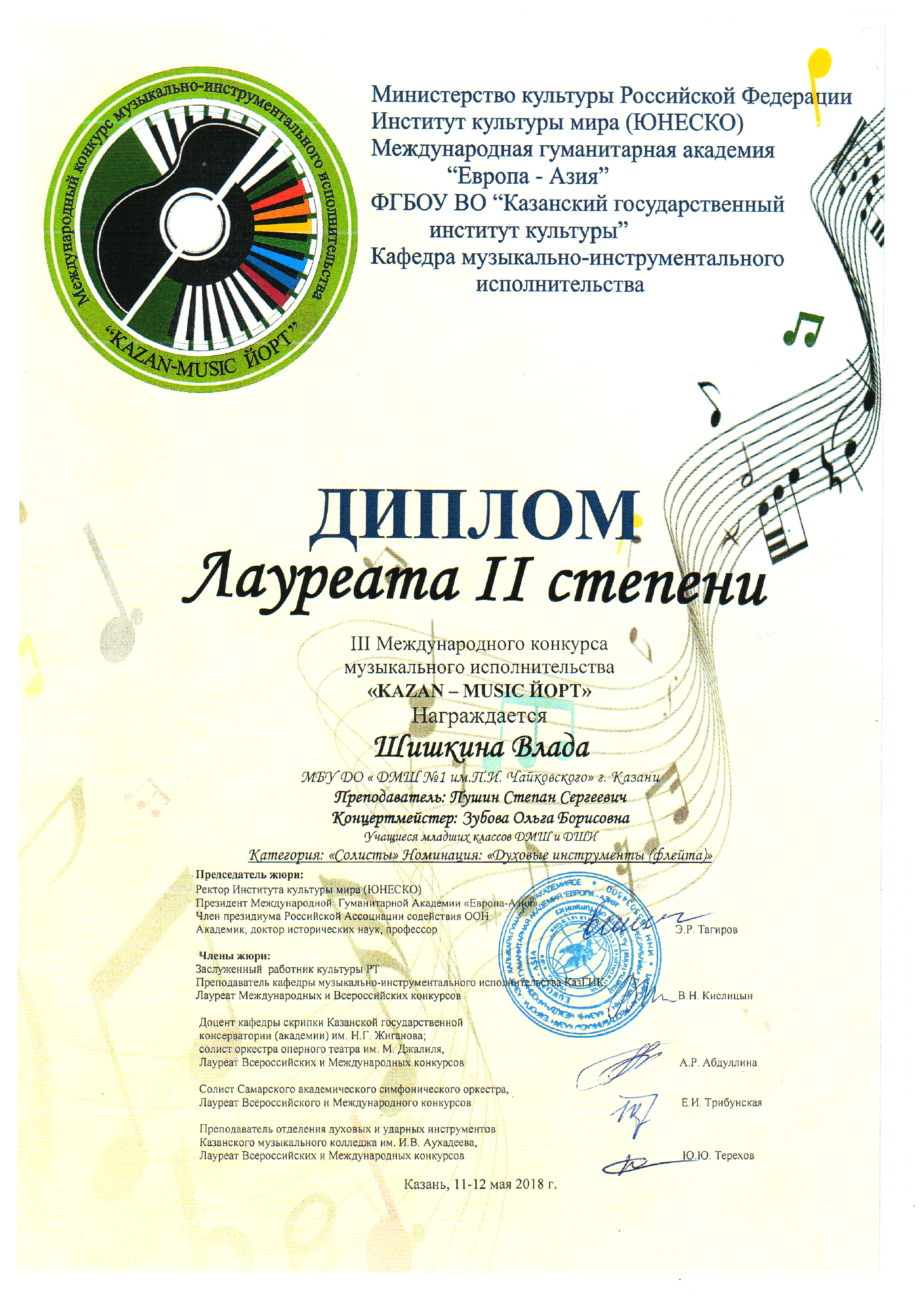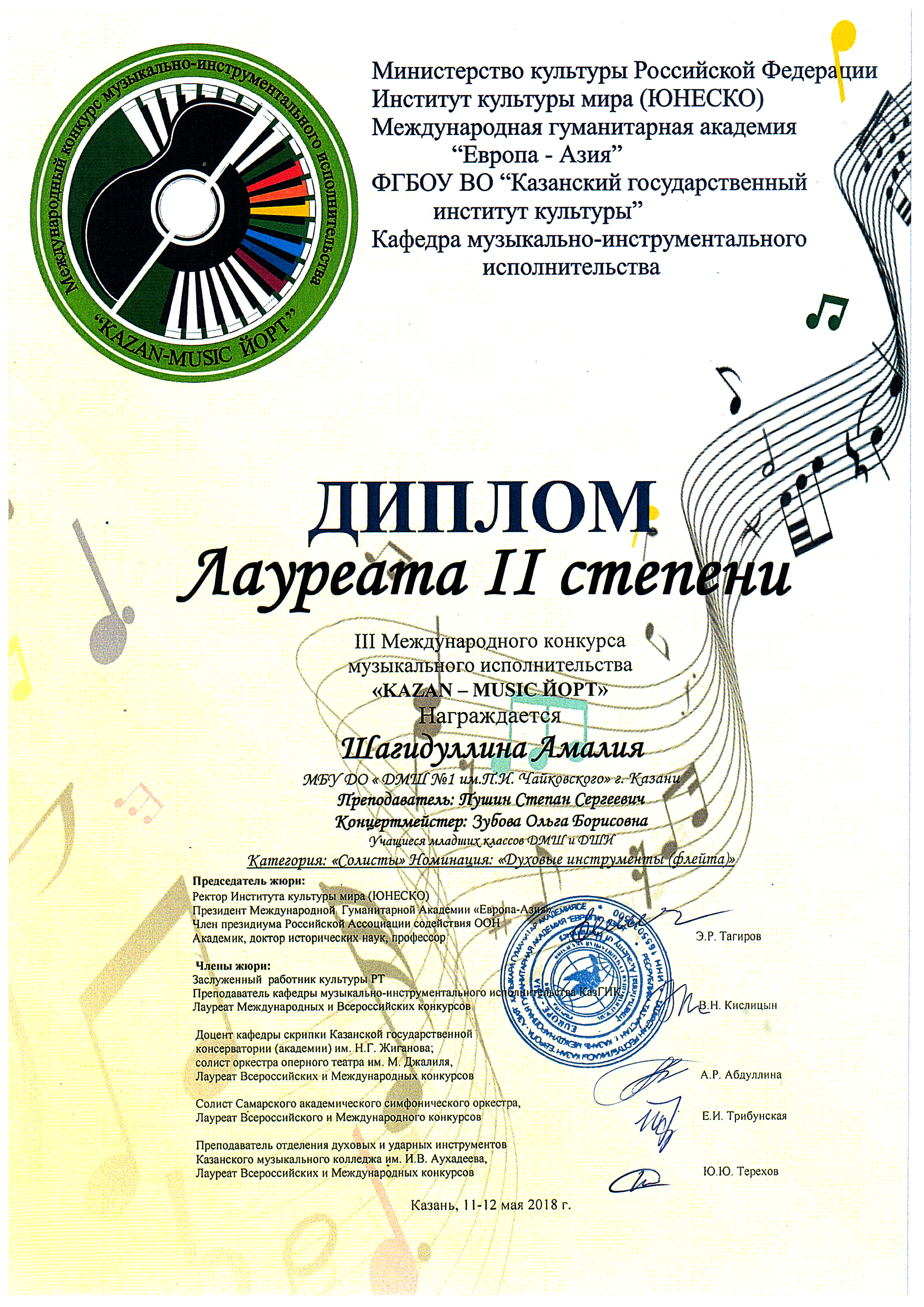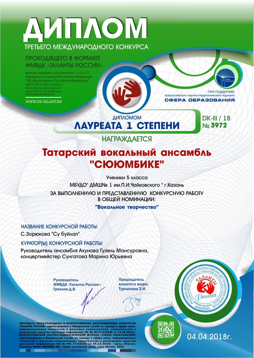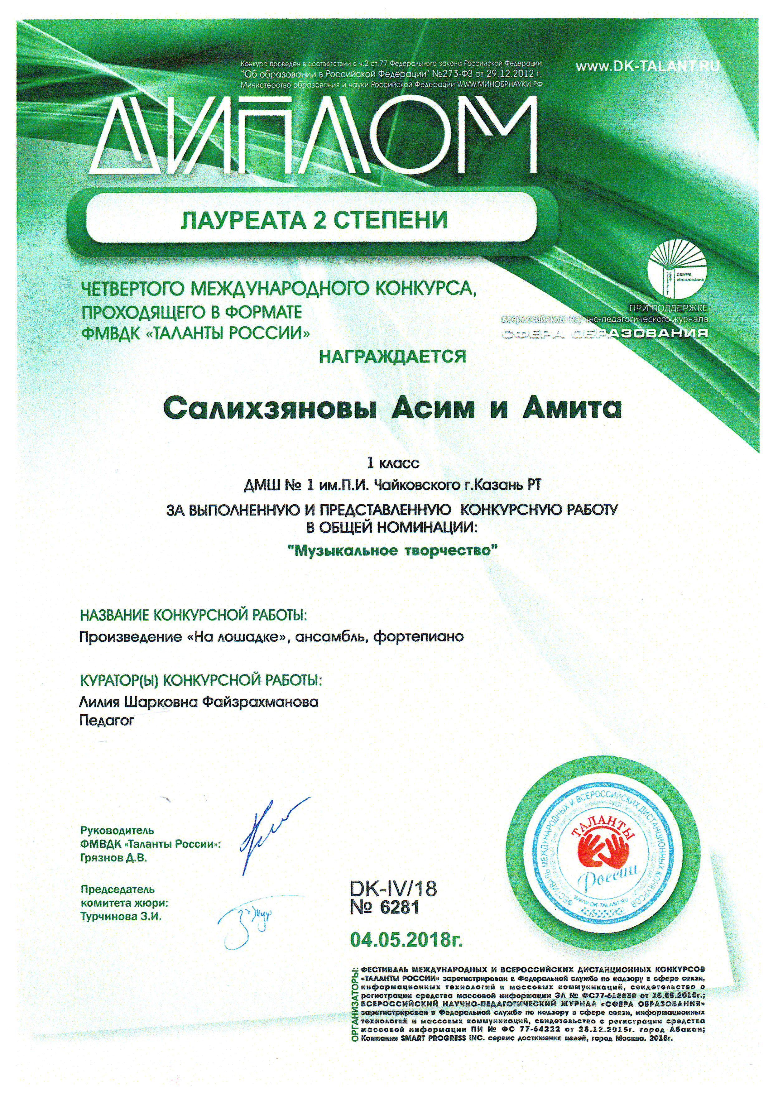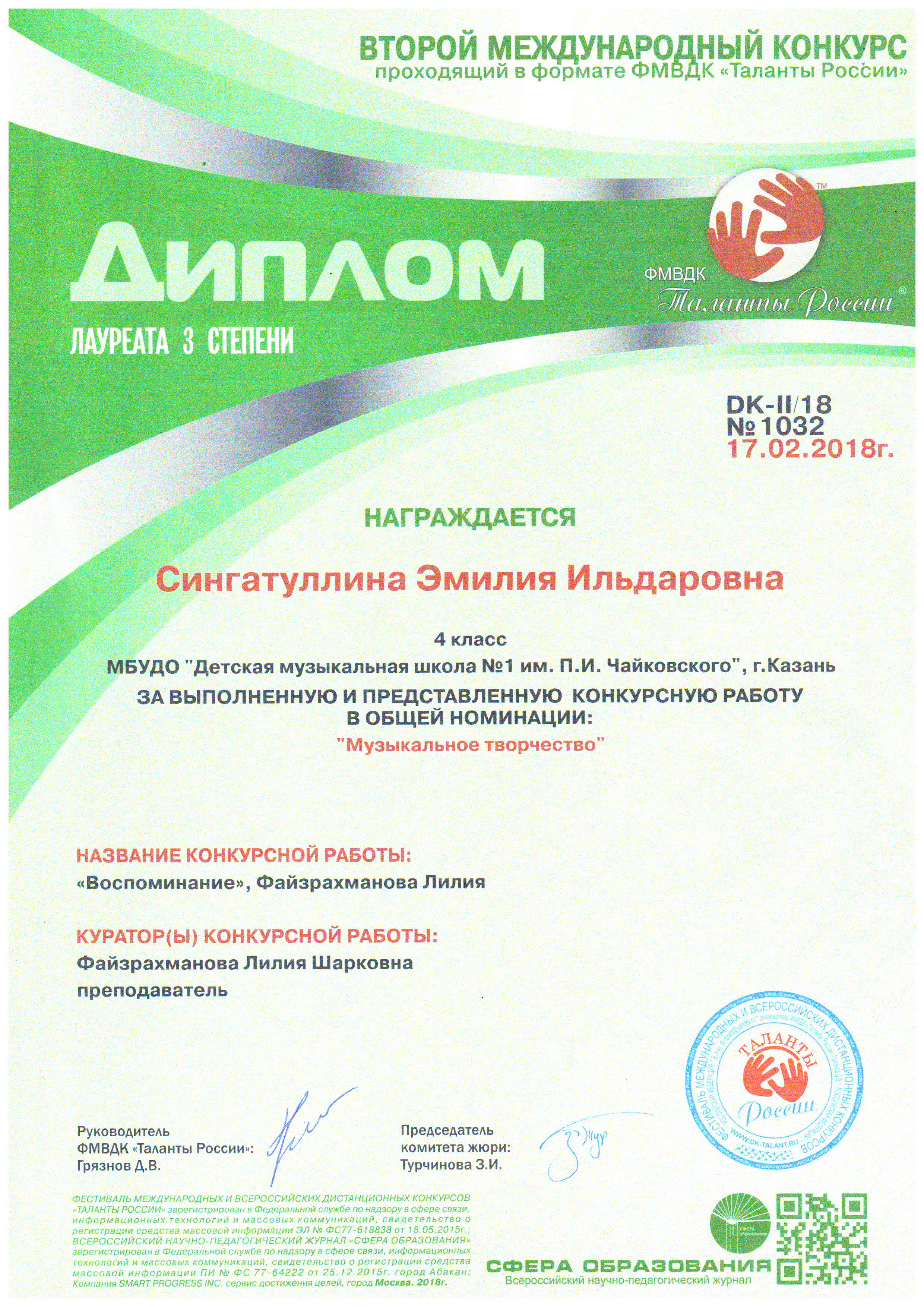 Второй Международный конкурс "Таланты России" - Сингатуллина Эмилия, Лауреат III степени;