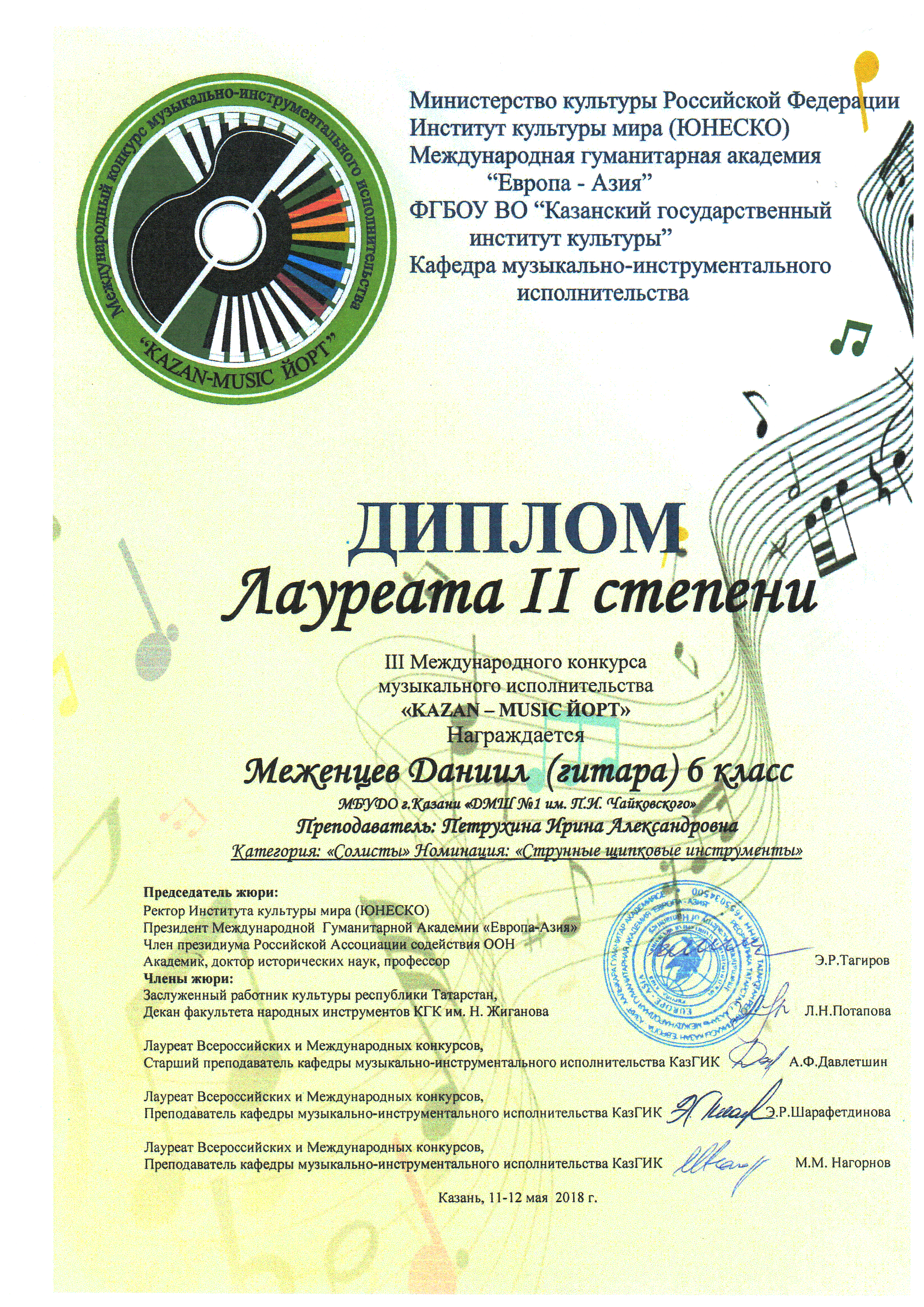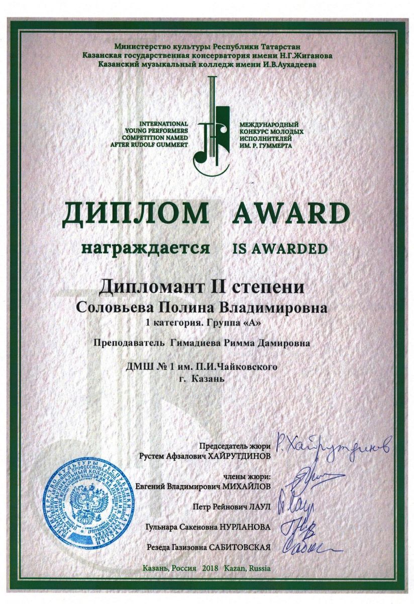 Международный конкурс молодых исполнителей им.Р.Гуммерта - Соловьева Полина, Дипломант II степени;
