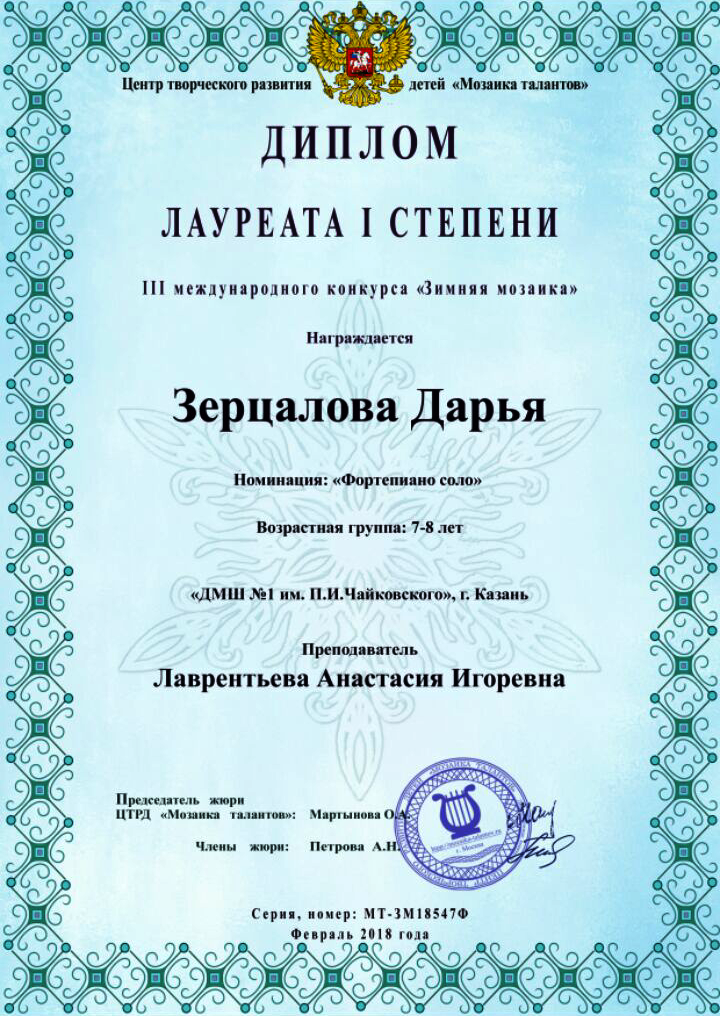 III Международный конкурс "Зимняя мозаика" - Зерцалова Дарья, Лауреат I степени;
