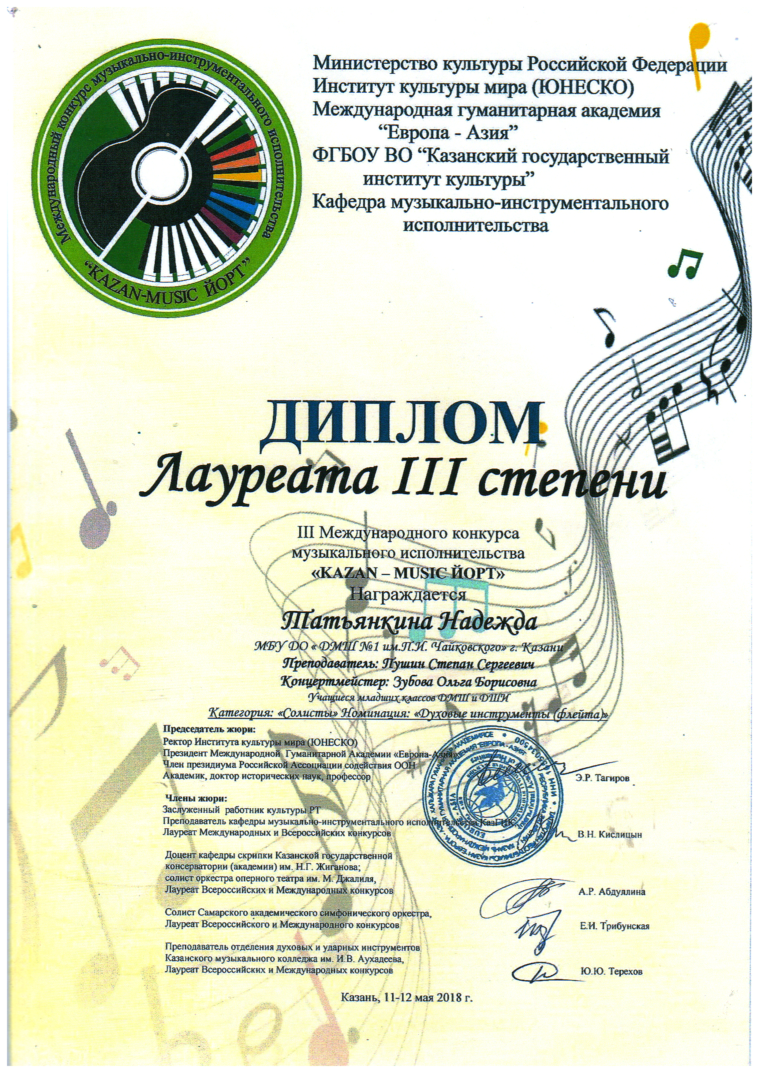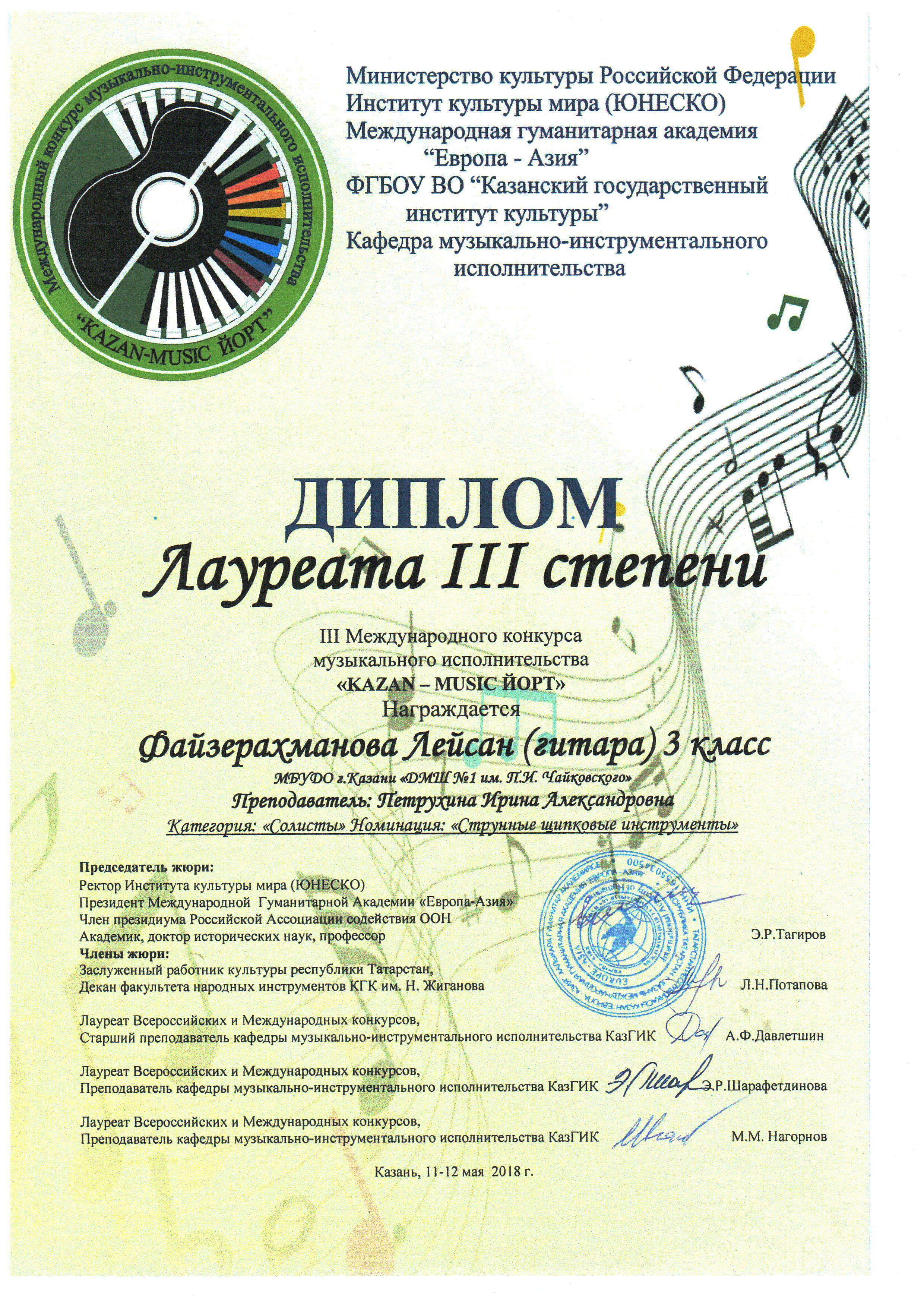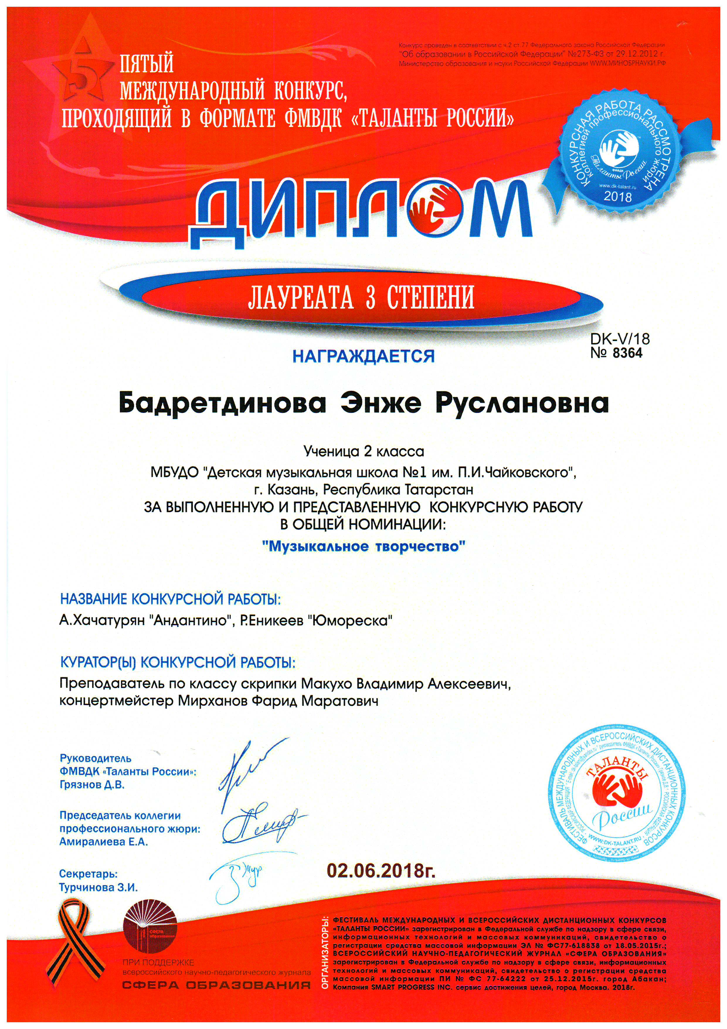 Третий Международный конкурс "Таланты России" - Бадретдинова Энже, Лауреат III степени;