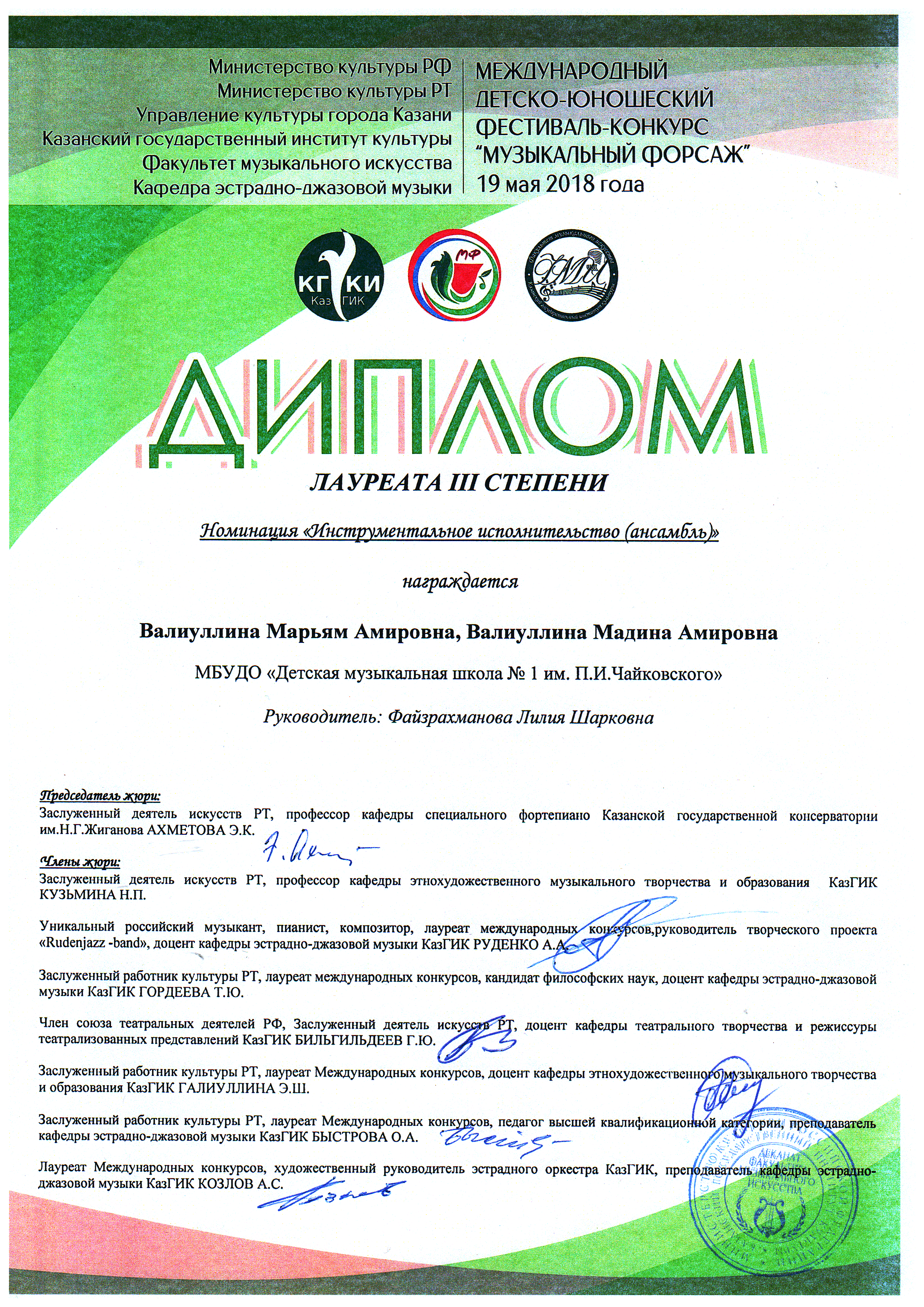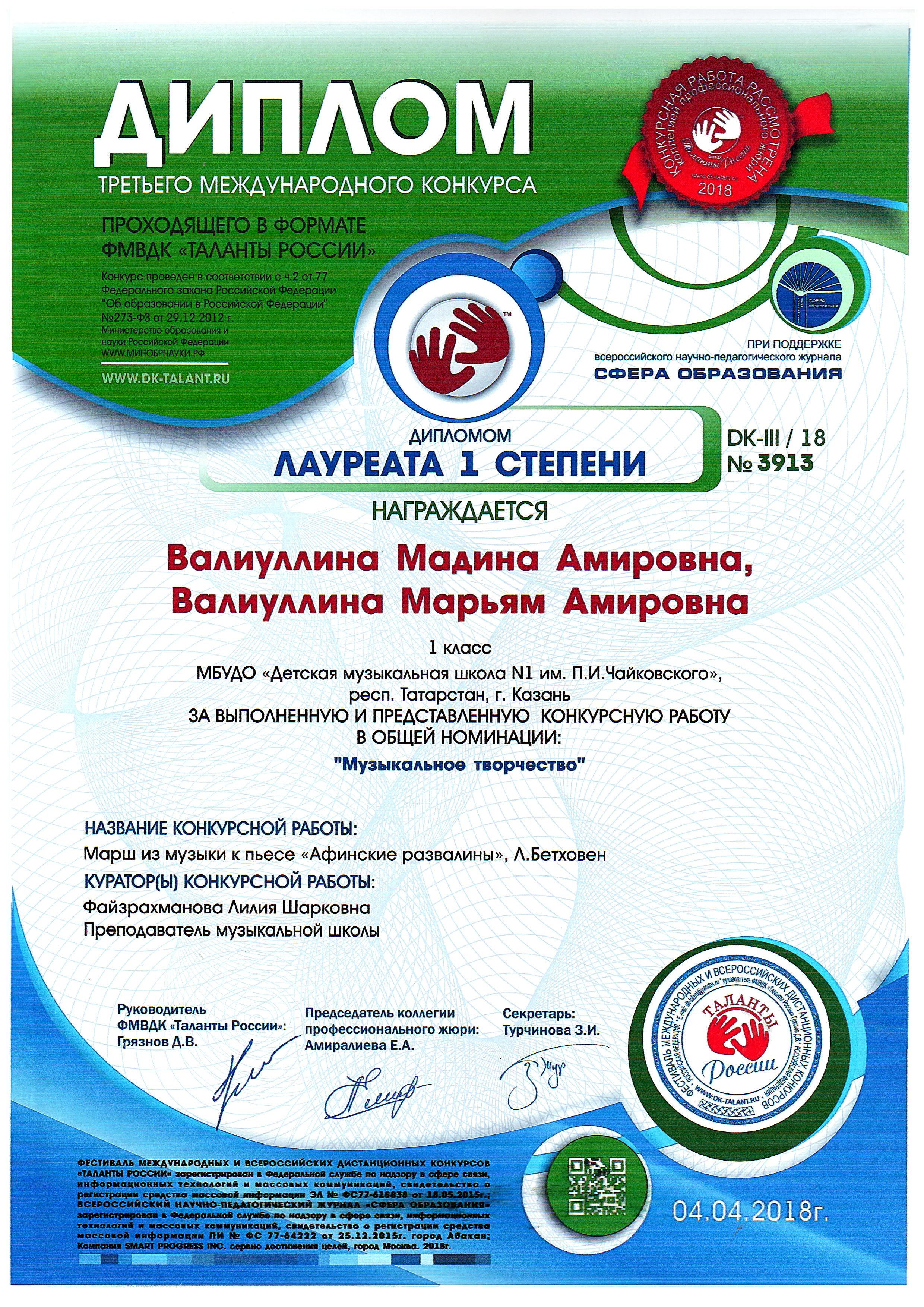Третий Международный конкурс "Таланты России" - Валиуллины Мадина и Марьям, Лауреаты I степени;