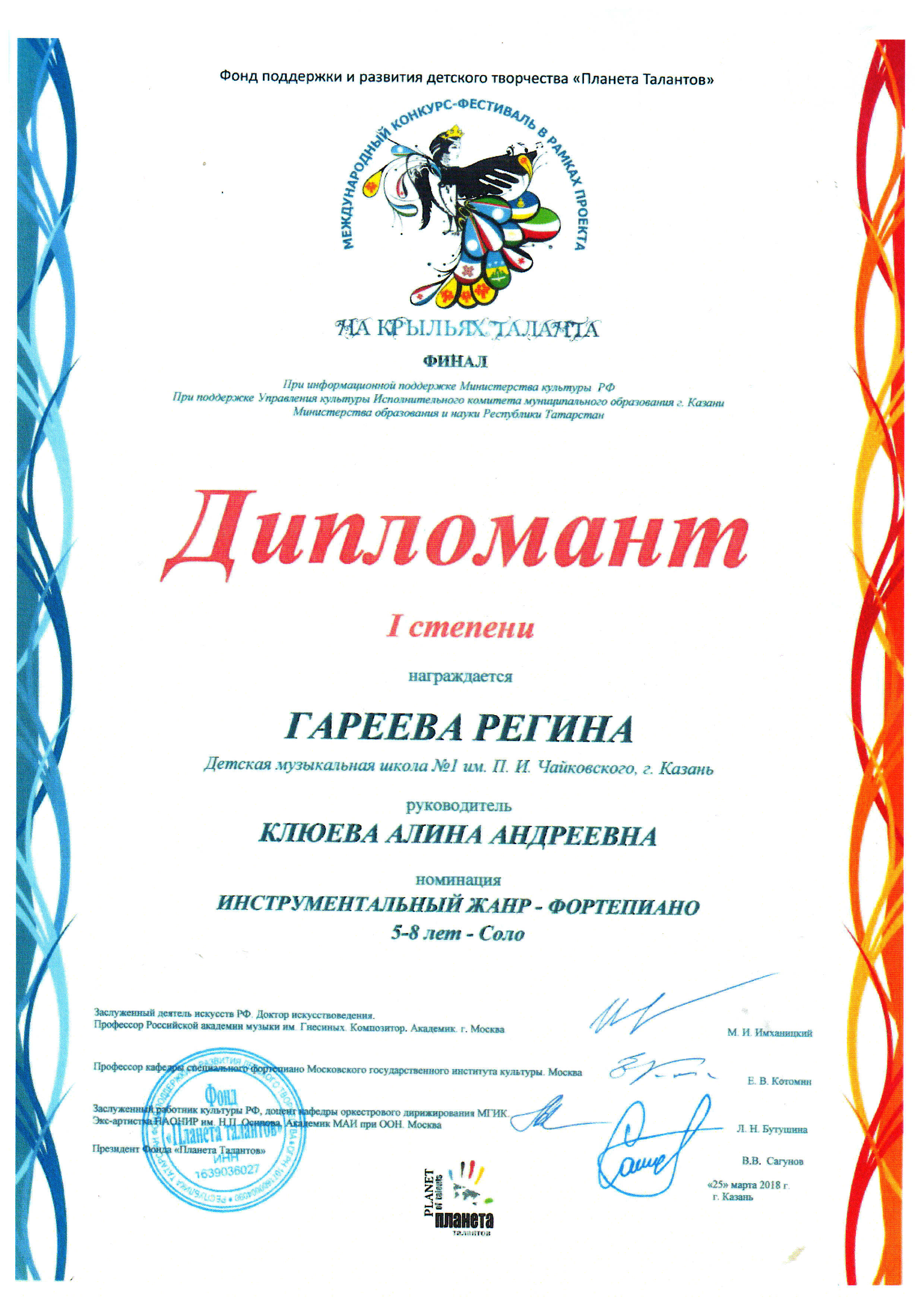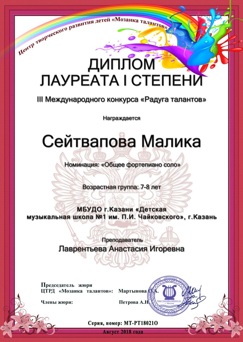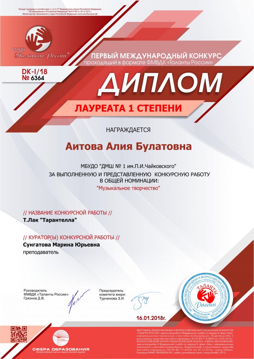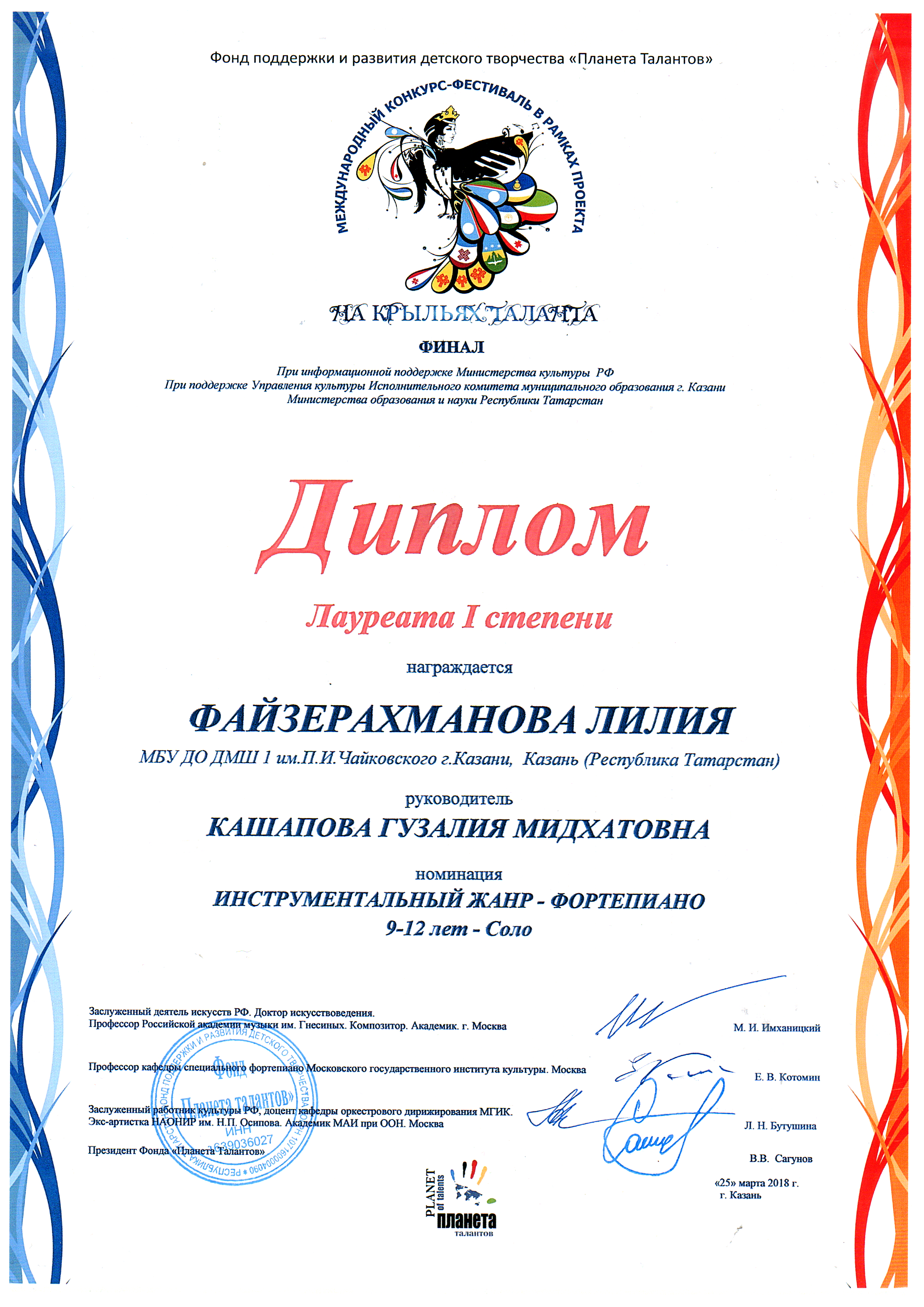 Первый Международный конкурс "Таланты России" - Аитова Алия, Лауреат I степени;