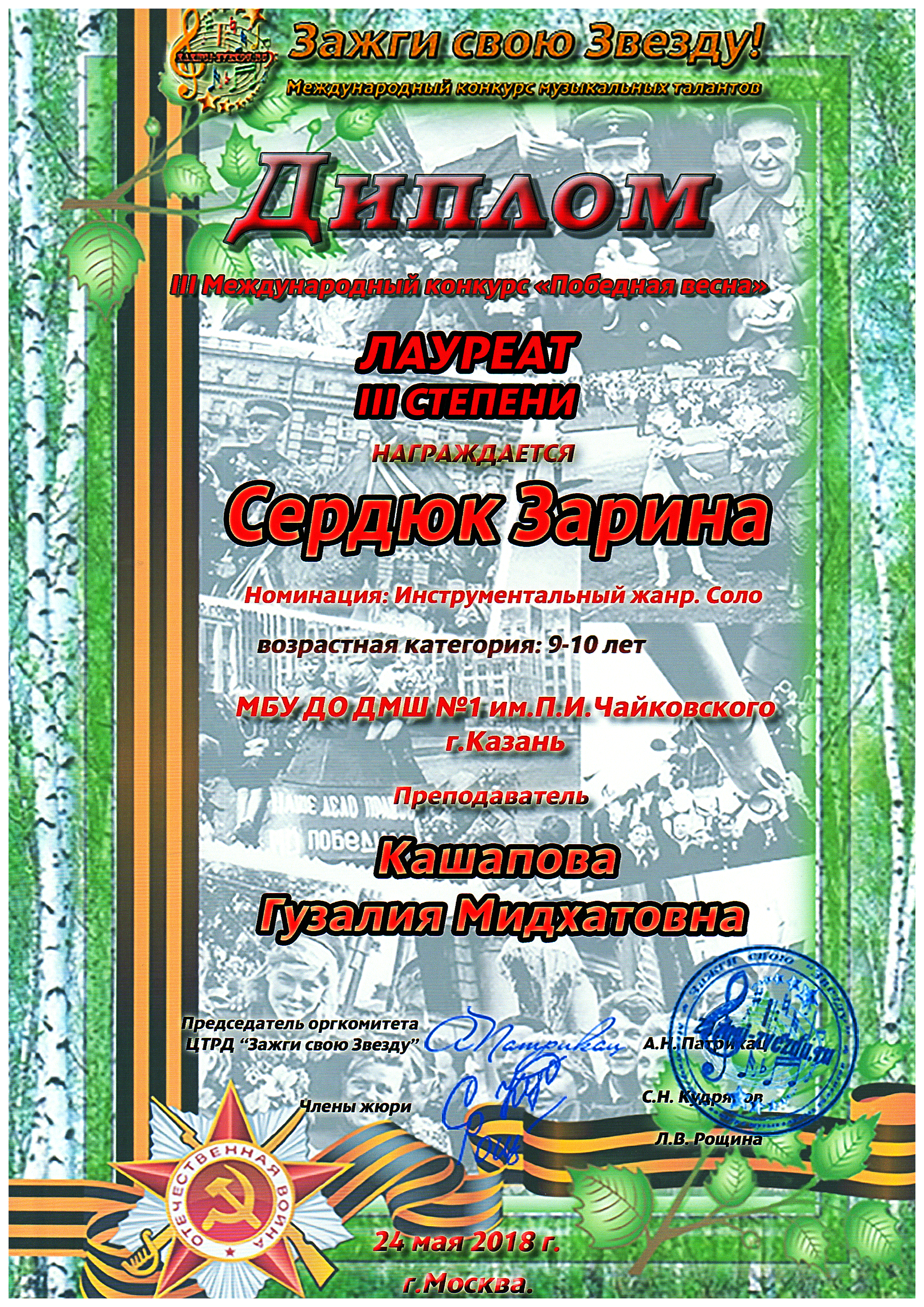 III Международный конкурс "Победная весна" - Сердюк Зарина, Лауреат III степени;