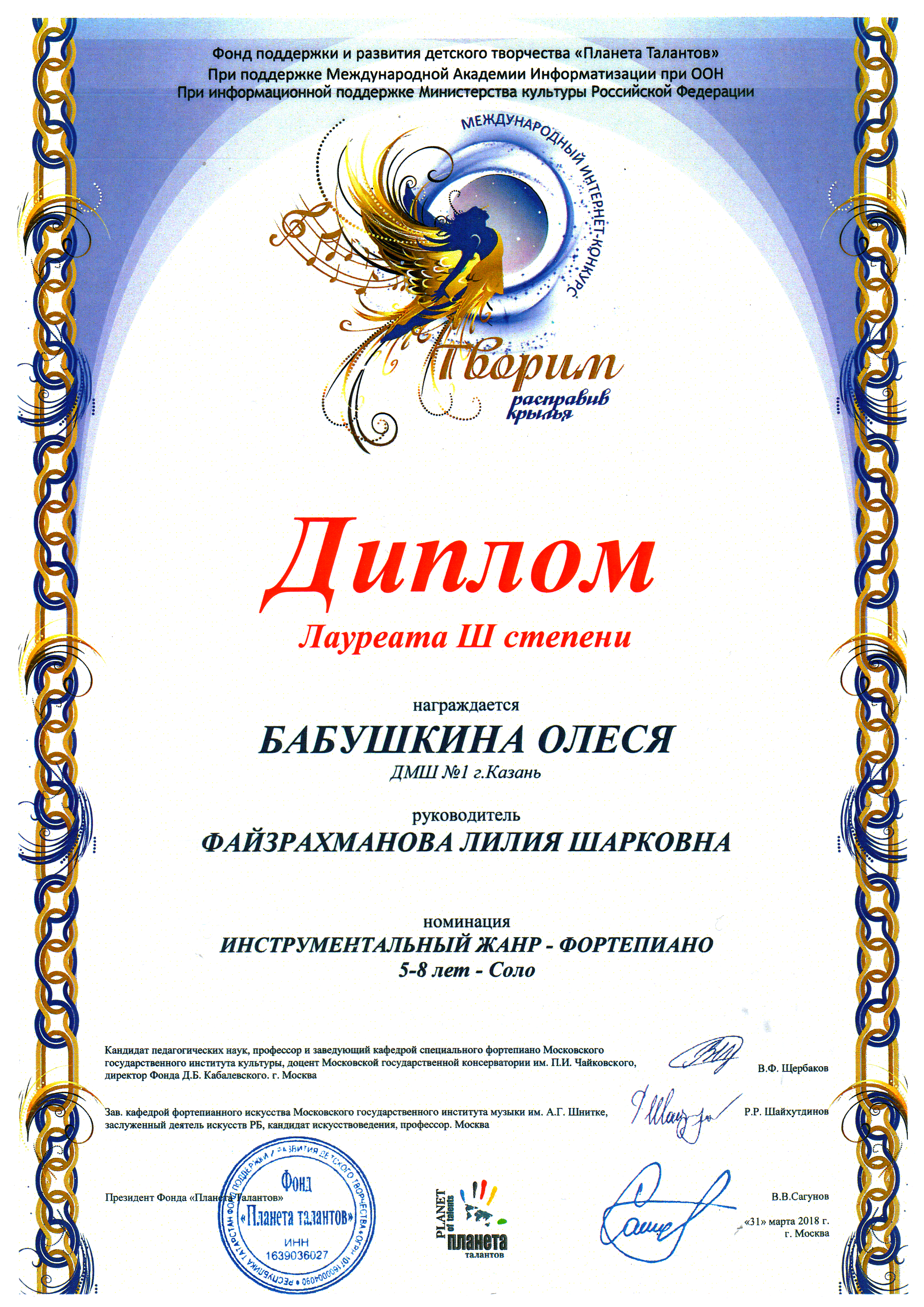 Второй Международный конкурс "Таланты России" - Бабушкина Олеся, Лауреат II степени;