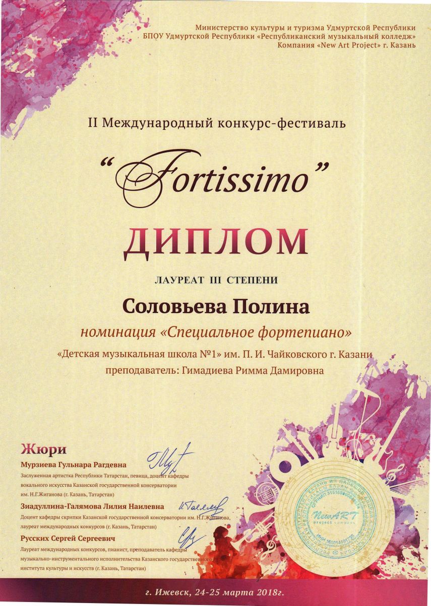 II Международный конкурс-фестиваль "Fortissimo" - Соловьёва Полина, Лауреат III степени;